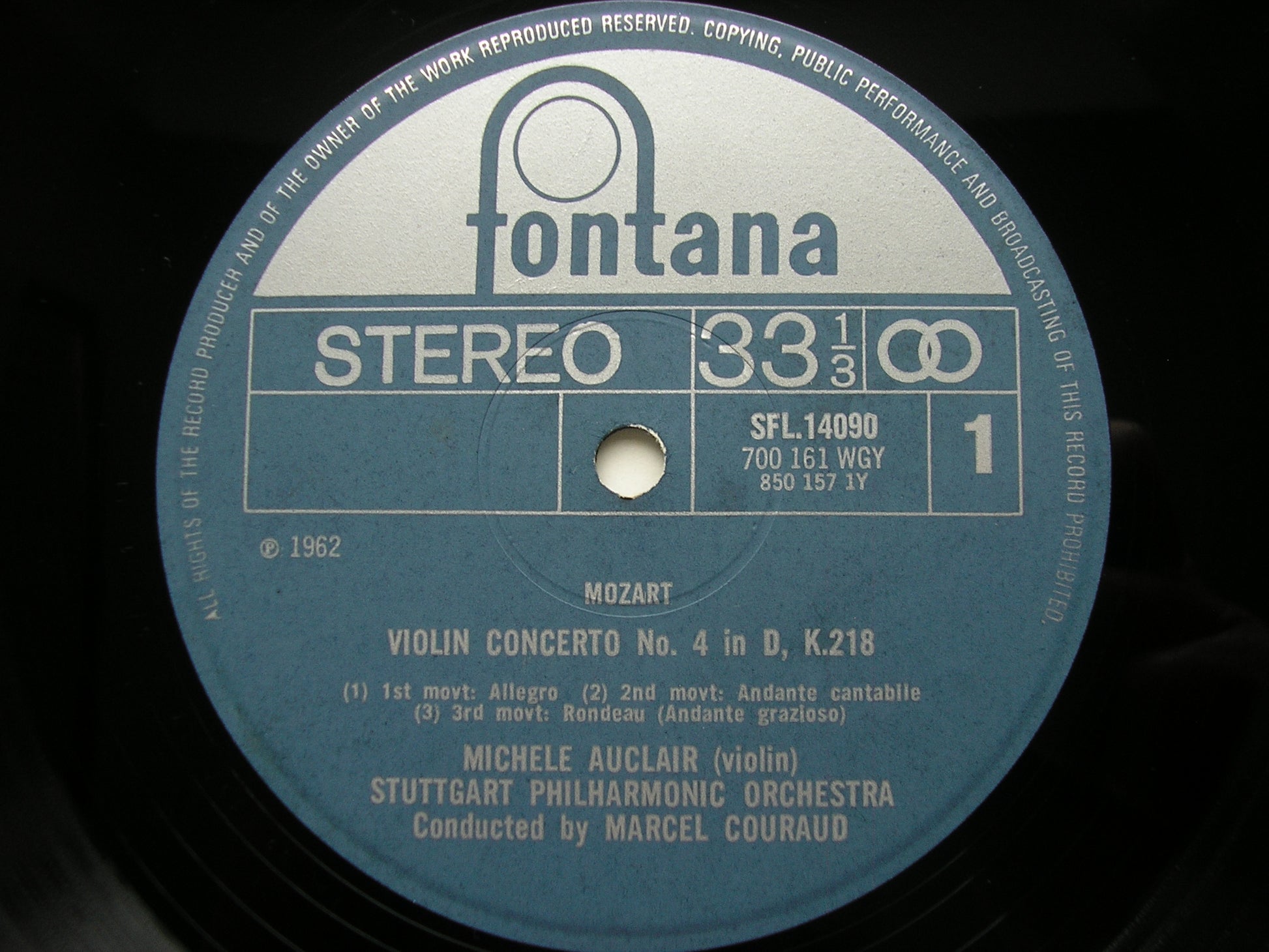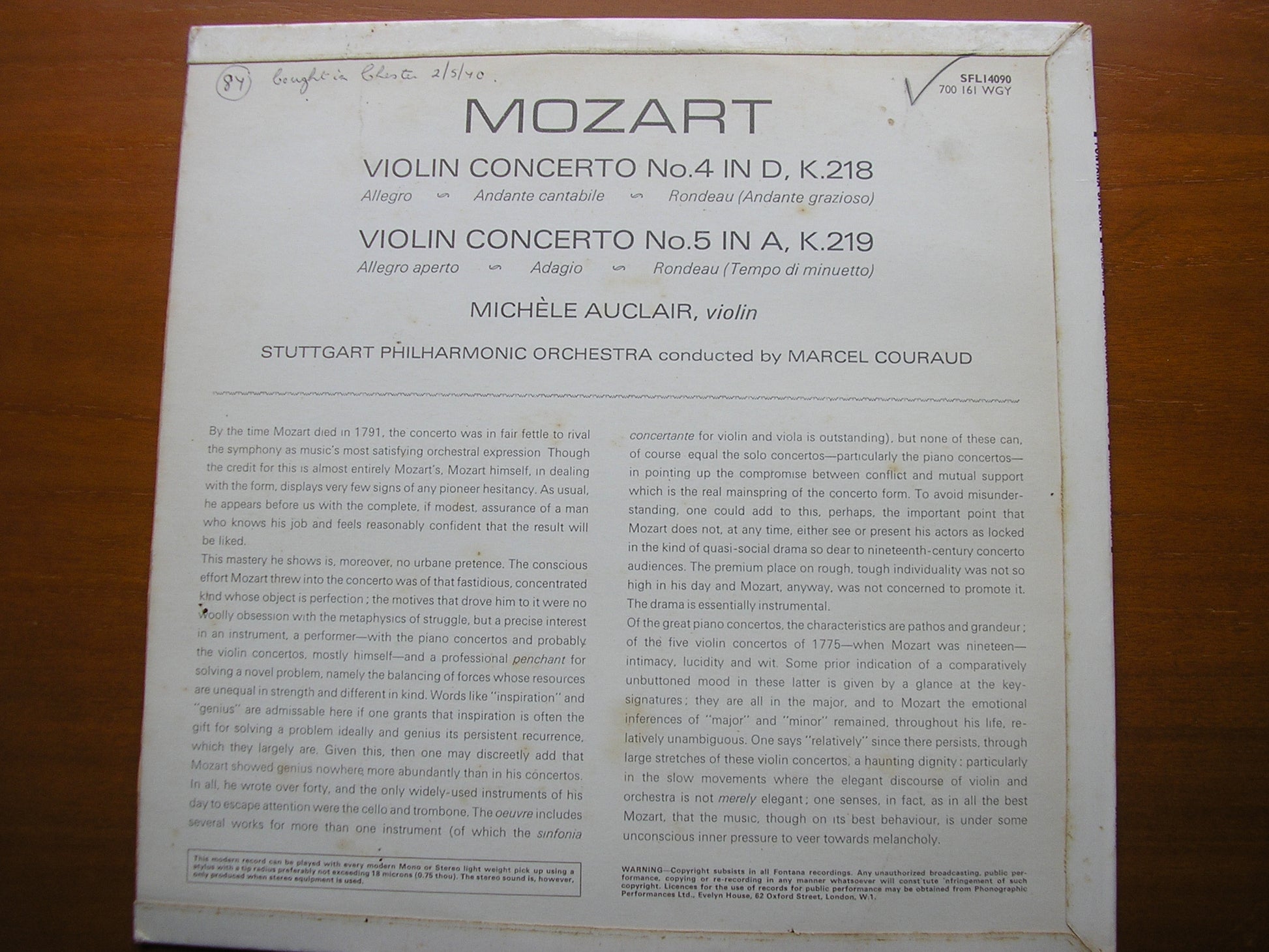 SFL 14090  MOZART: VIOLIN CONCERTOS No. 4 K218 & No. 5 K219     MICHELE AUCLAIR / STUTTGART PHILHARMONIC ORCHESTRA / MARCEL COURAUD