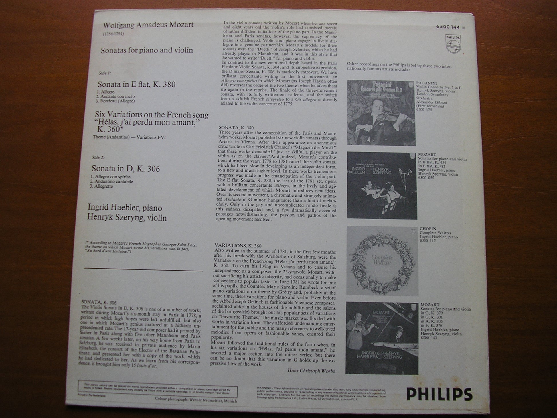6500 144  MOZART: VIOLIN SONATAS K 306 & K380 / VARIATIONS K360     INGRID HAEBLER / HENRYK SZERYNG