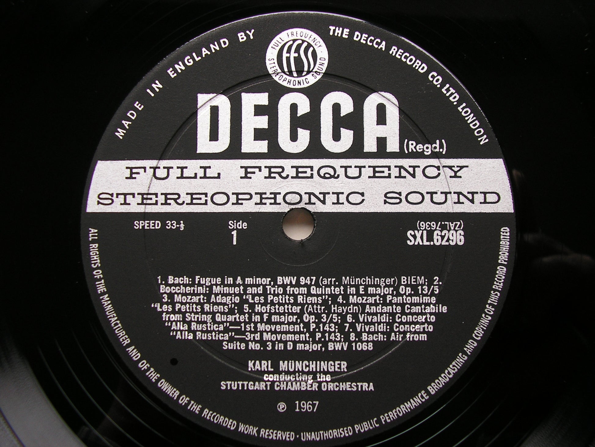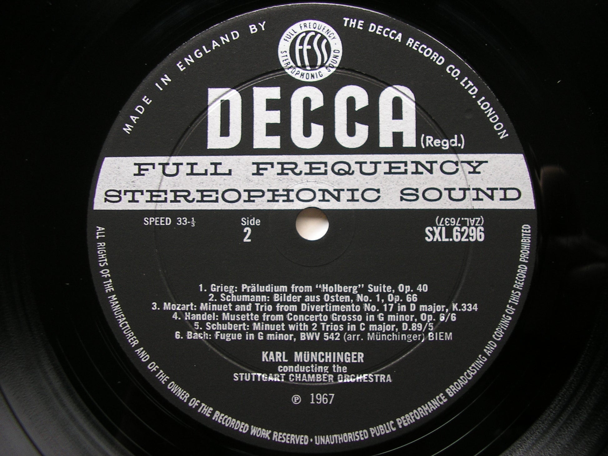 SXL 6296  BACH / BOCCHERINI / HOFSTETTER / VIVALDI / HANDEL / SCHUBERT / MOZART / SCHUMANN / GREIG:  ORCHESTRAL WORKS    KARL MUNCHINGER / STUTTGART CHAMBER ORCHESTRA