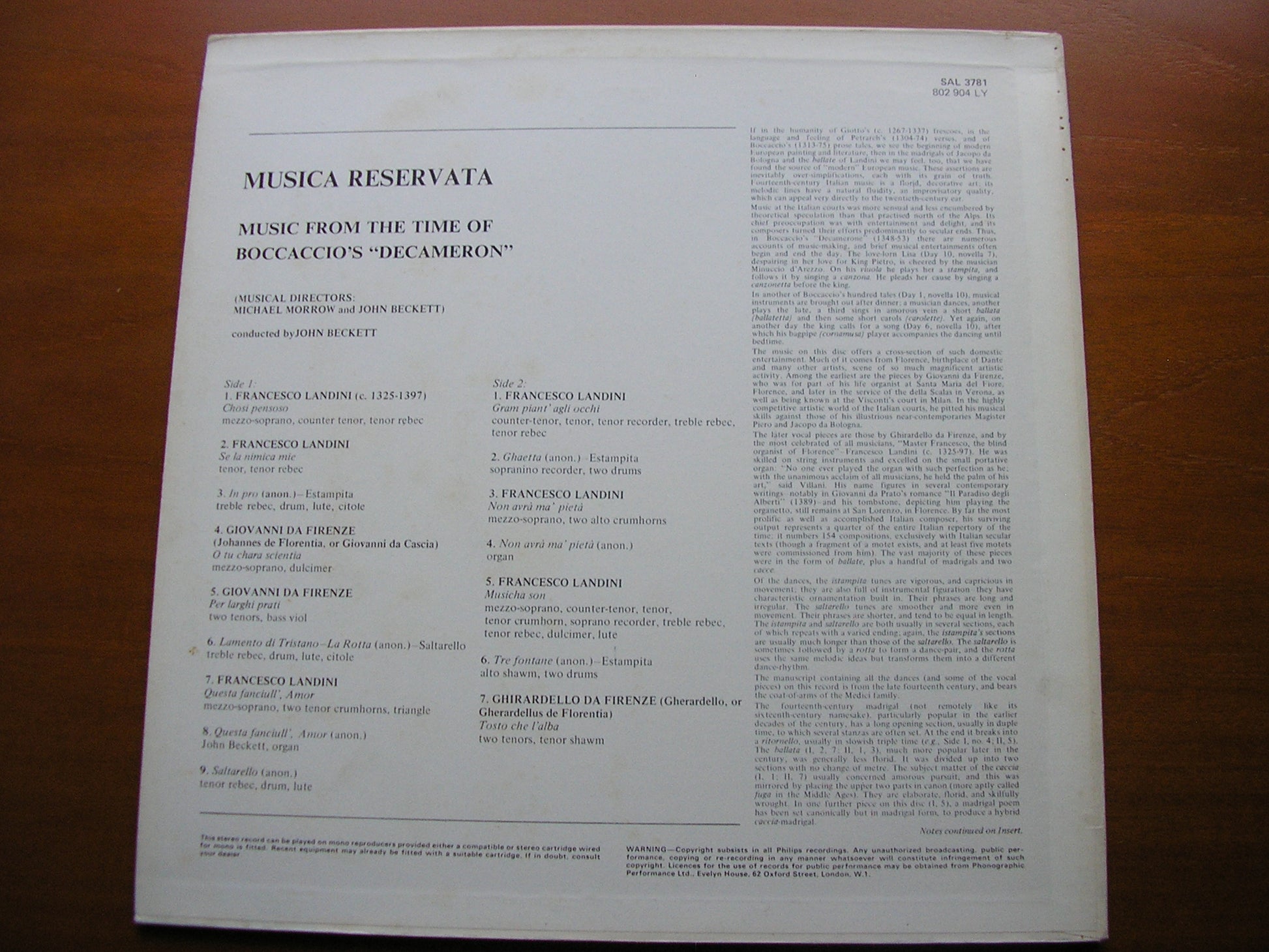 SAL 3781  LANDINI / GIOVANNI DA FIRENZE / GHIRARDELLO       MUSICA RESERVATA / JOHN BECKETT