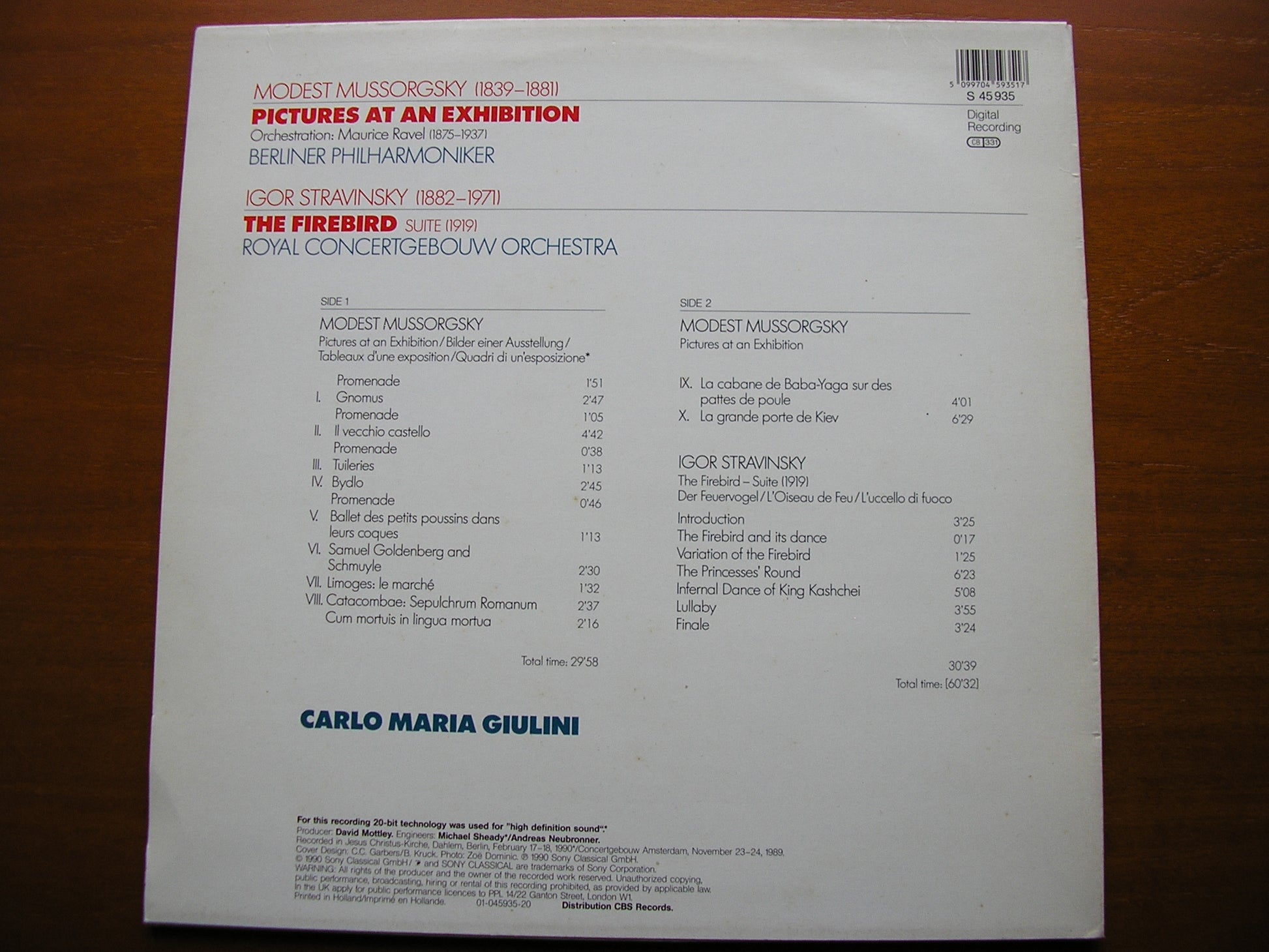 S 45935  MUSSORGSKY: PICTURES AT AN EXHIBITION* / STRAVINSKY: THE FIREBIRD Suite    CARLO MARIA GIULINI / *BERLIN PHILHARMONIC ORCHESTRA / CONCERTGEBOUW ORCHESTRA AMSTERDAM