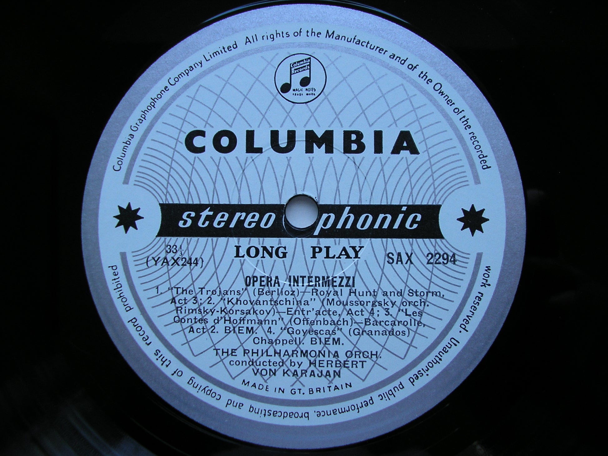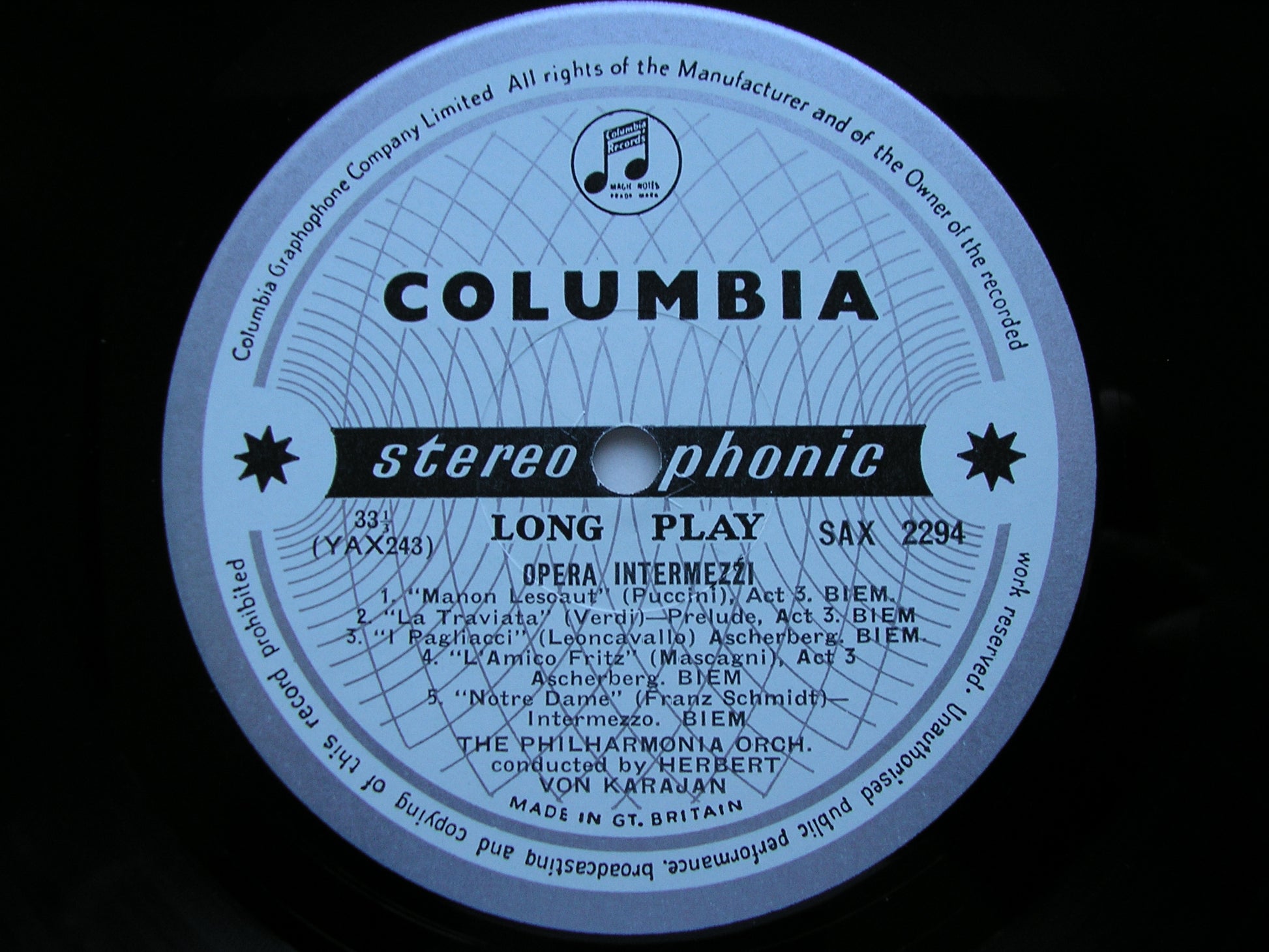 SAX 2294  OPERA INTERMEZZI: MASCAGNI / PUCCINI / VERDI / SCHMIDT / GRANADOS / MUSSORGSKY / BERLIOZ     HERBERT VON KARAJAN / PHILHARMONIA ORCHESTRA