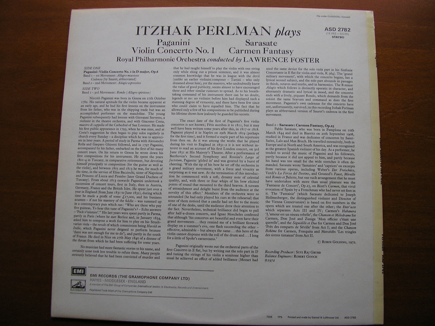 ASD 2782  PAGANINI: VIOLIN CONCERTO No. 1 / SARASATE: CARMEN FANTASY   ITZHAK PERLMAN / ROYAL PHILHARMONIC ORCHESTRA / LAWRENCE FOSTER