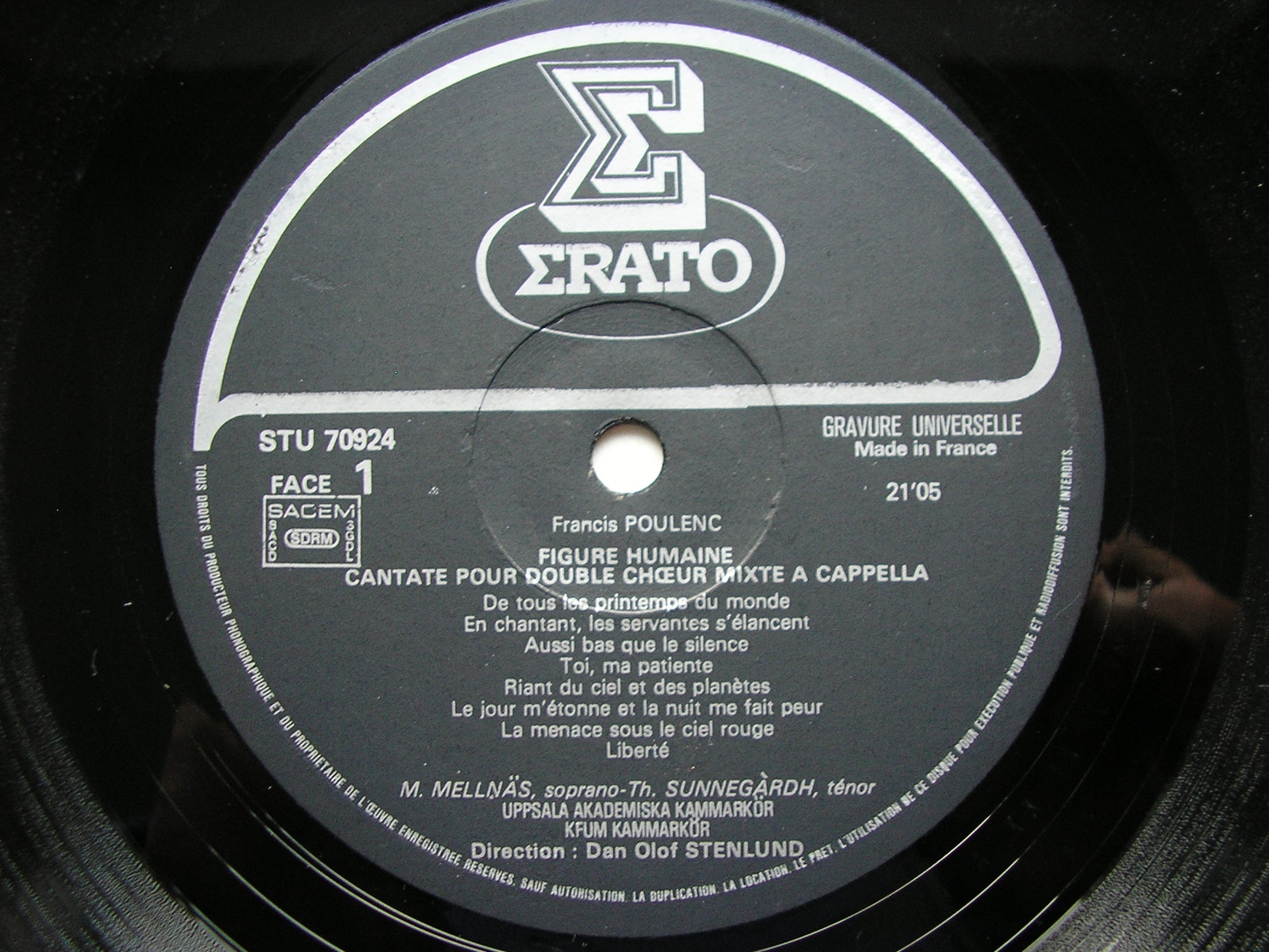 STU 70924  POULENC: FIGURE HUMAINE / MASS in G / FOUR LITTLE PRAYERS OF ST FRANCIS OF ASSISI           SOLOISTS / UPPSALA AKADEMISKA KAMMARKOR / STENLUND