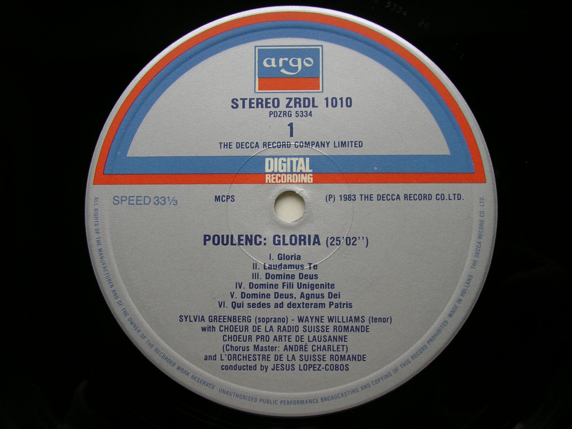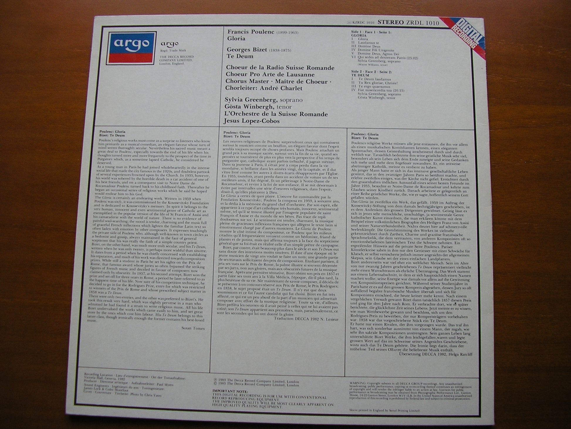 ZRDL 1010  POULENC: GLORIA / BIZET: TE DEUM    SYLVIA GREENBERG / GOSTA WINBERGH / SUISSE ROMANDE ORCHESTRA / JESUS LOPEZ-COBOS