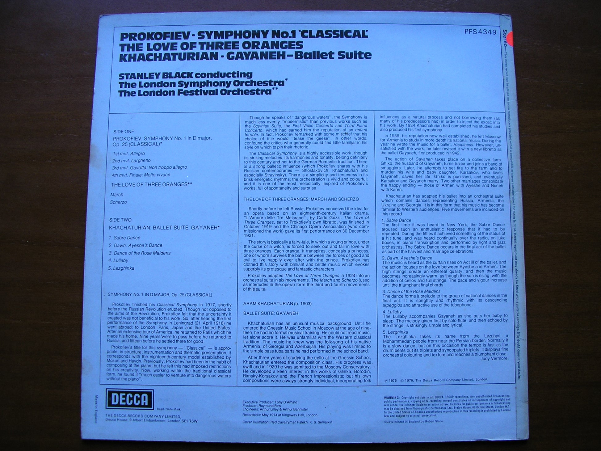 PFS 4349  PROKOFIEV: CLASSICAL SYMPHONY / MARCH & SCHERZO from The Love of Three Oranges / KHACHATURIAN: GAYANEH excerpts      STANLEY BLACK / LONDON SYMPHONY ORCHESTRA / LONDON FESTIVAL ORCHESTRA