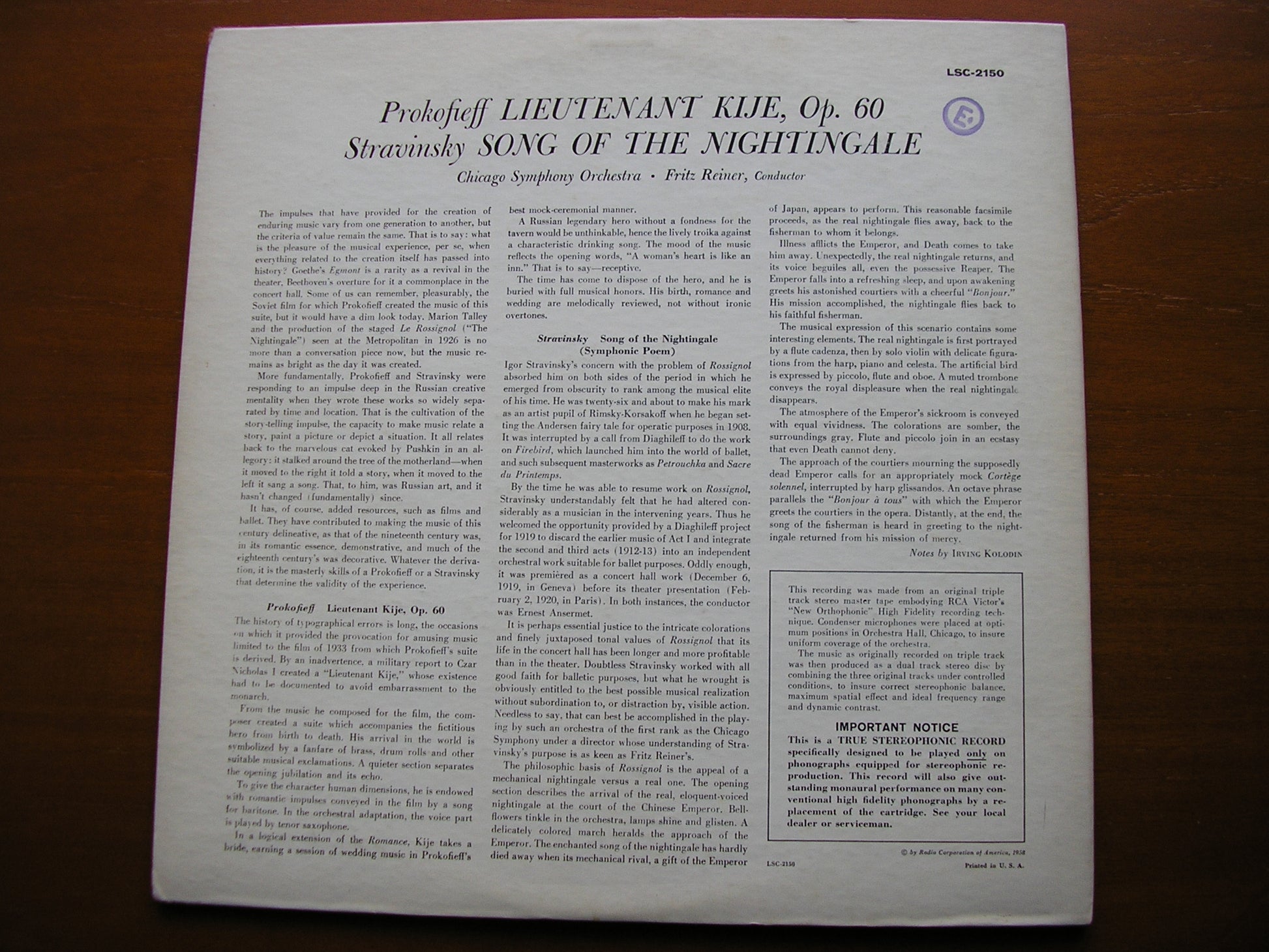 LSC 2150  PROKOFIEV: LIEUTENANT KIJE / STRAVINSKY: SONG OF THE NIGHTINGALE    FRITZ REINER / CHICAGO SYMPHONY ORCHESTRA