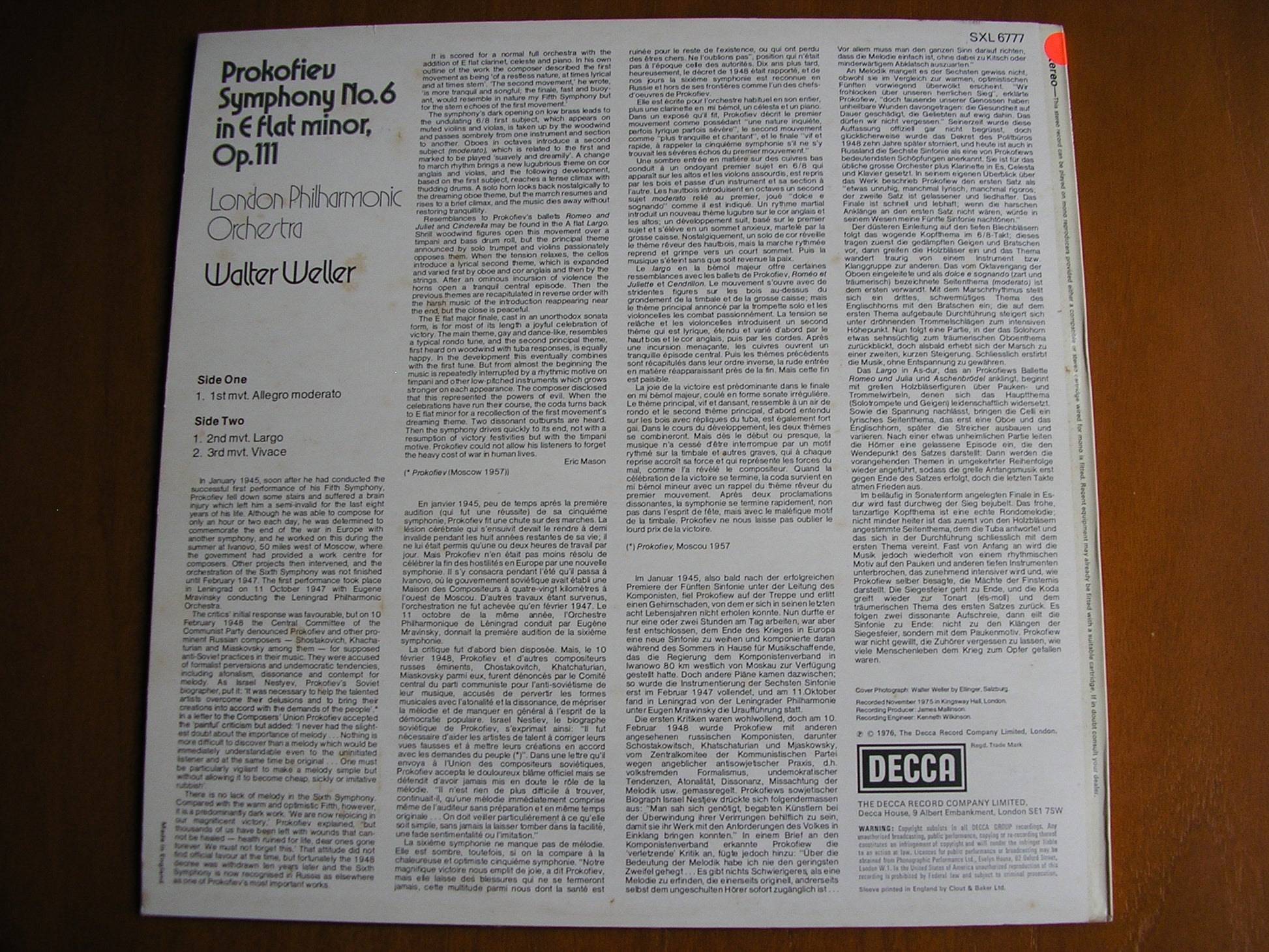 SXL 6777  PROKOFIEV: SYMPHONY No. 6     WALTER WELLER / LONDON PHILHARMONIC ORCHESTRA