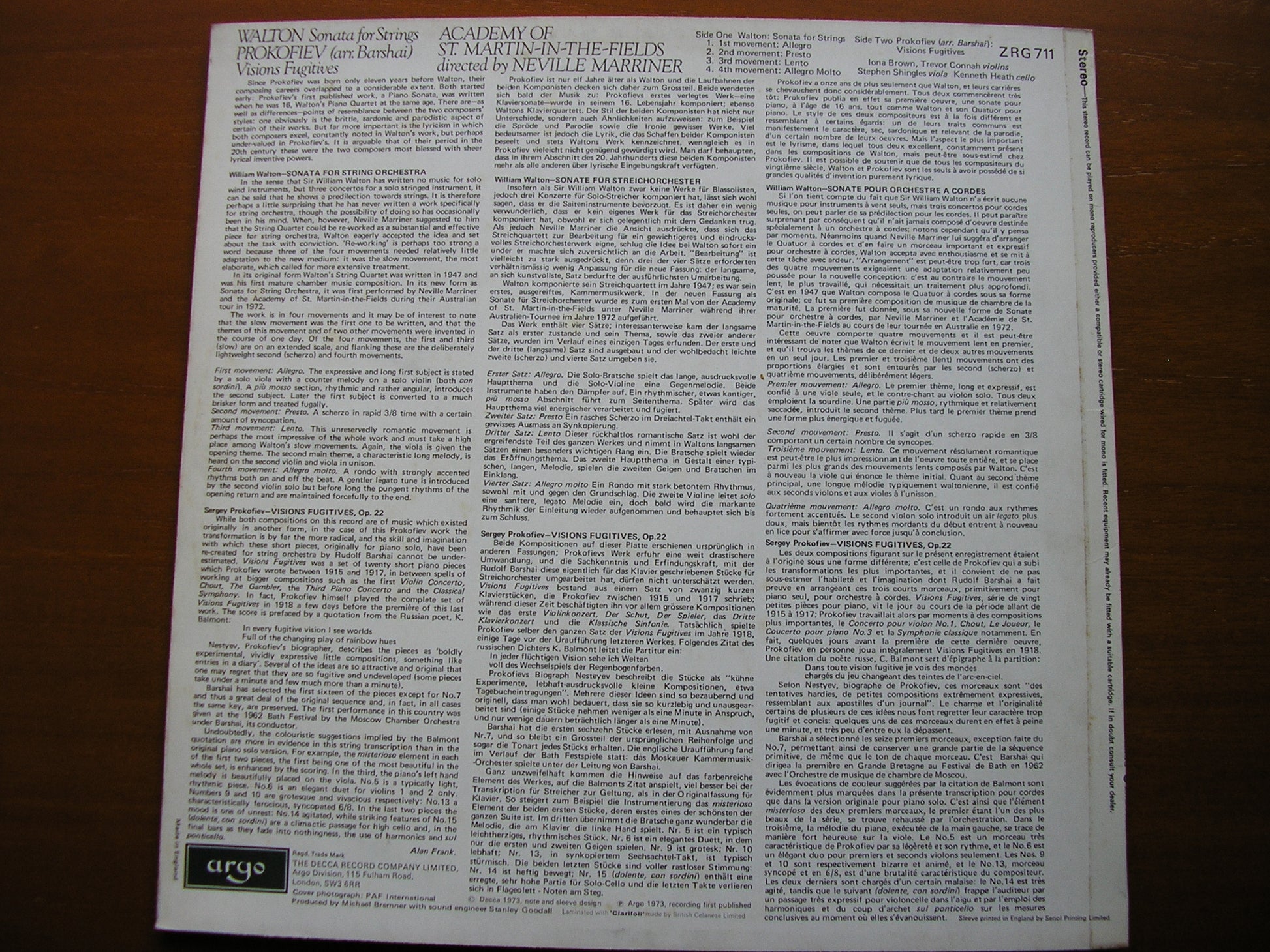 ZRG 711  PROKOFIEV: VISIONS FUGITIVES / WALTON: SONATA FOR STRINGS   NEVILLE MARRINER / ACADEMY OF ST MARTIN IN THE FIELDS