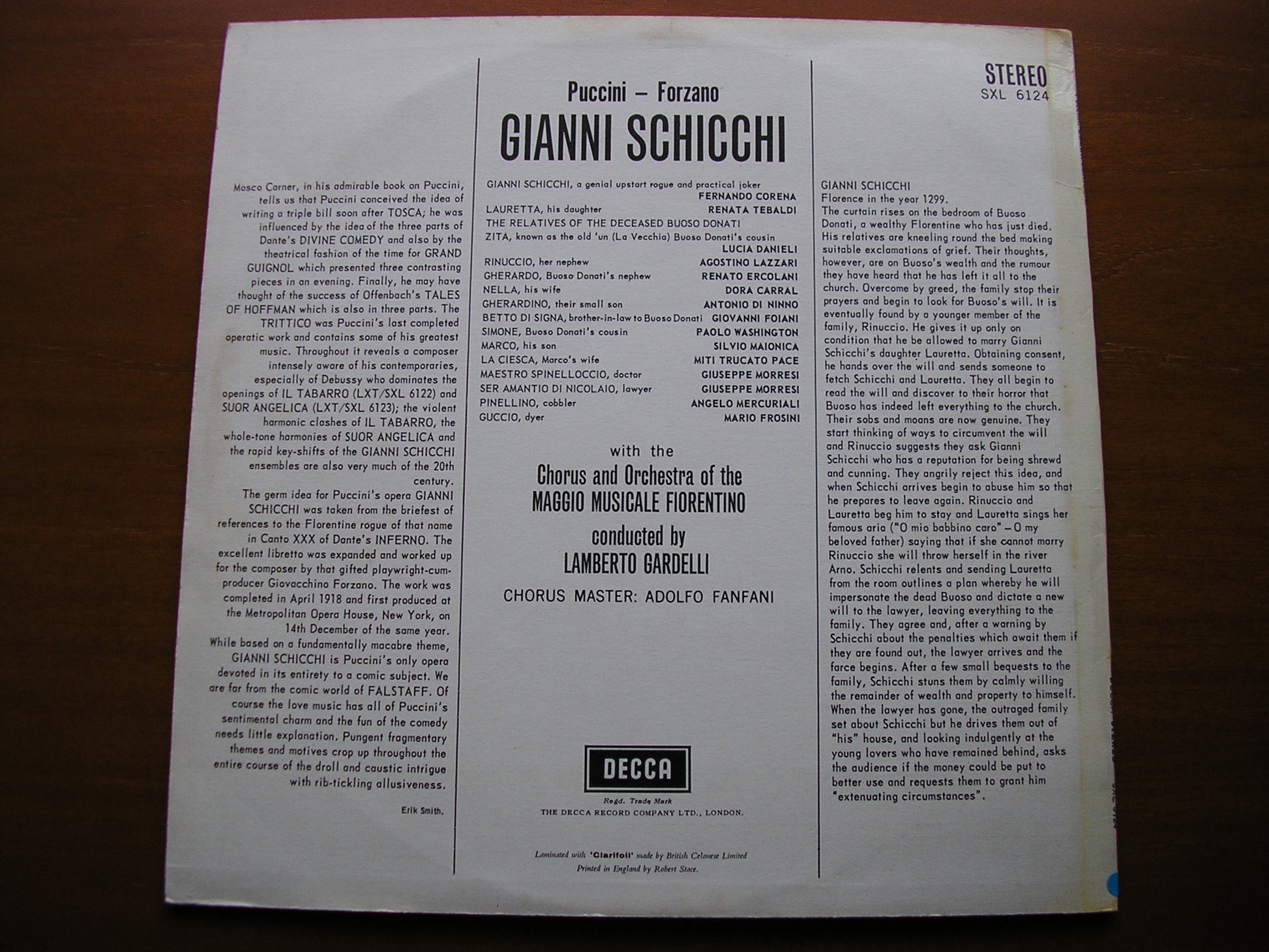 SXL 6124 PUCCINI: GIANNI SCHICCHI      FERNANDO CORENA / RENATA TEBALDI / MMF / LAMBERTO GARDELLI