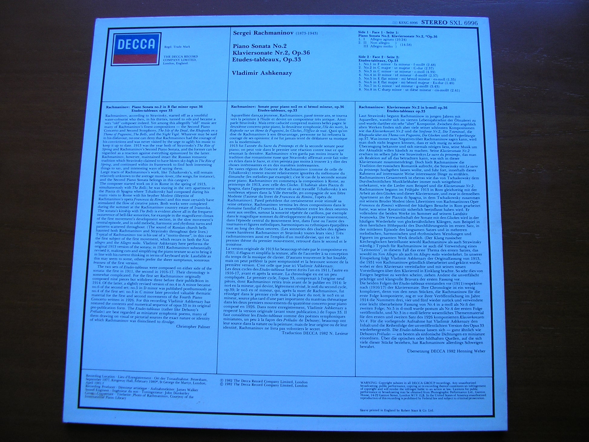 SXL 6996  RACHMANINOV: PIANO SONATA No. 2 / ETUDES TABLEAUX Op. 33   VLADIMIR ASHKENAZY