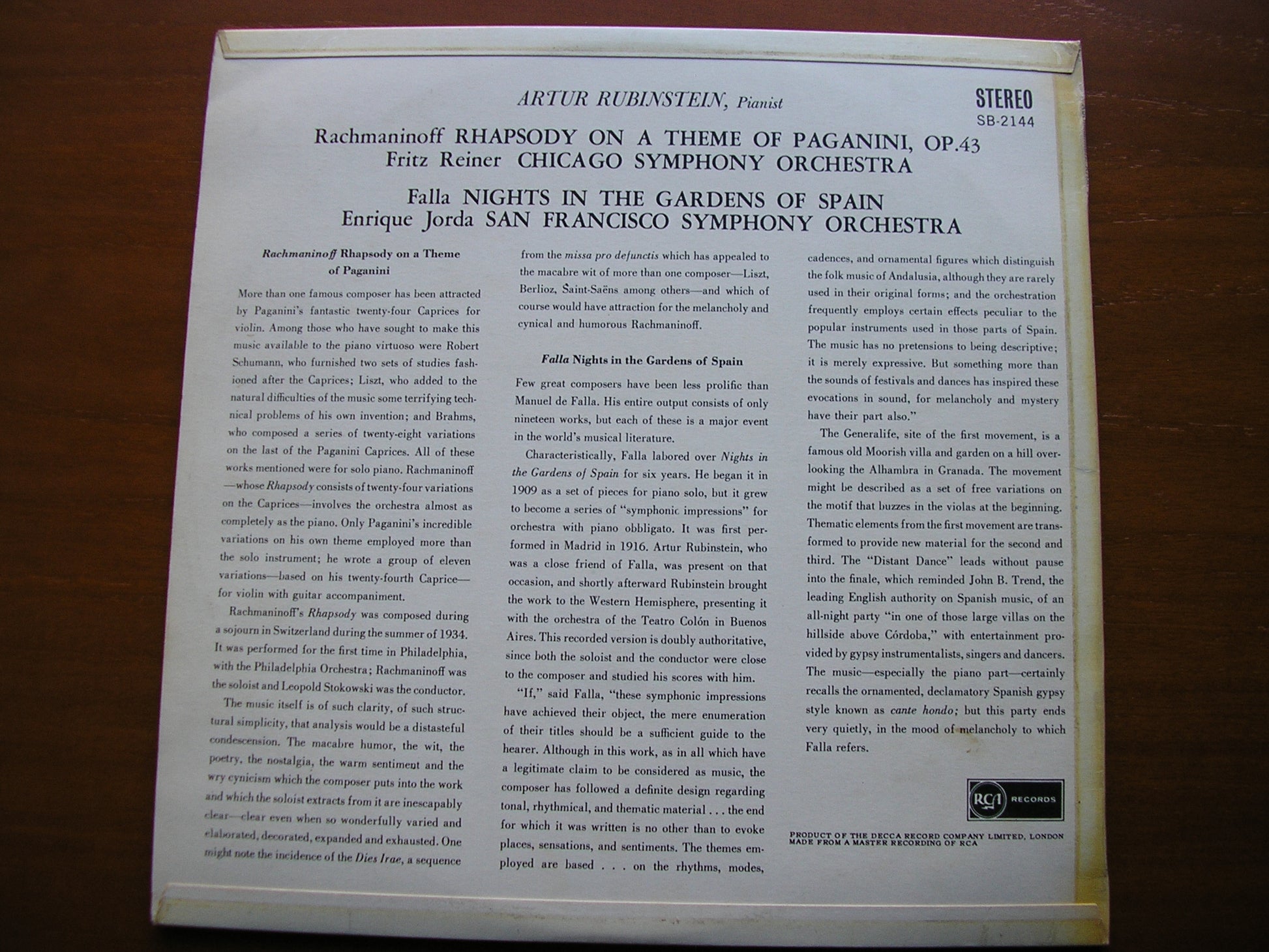 SB 2144  (LSC 2430) RACHMANINOV: RHAPSODY ON A THEME OF PAGANINI / ARTUR RUBINSTEIN / CHICAGO SYMPHONY ORCHESTRA / FRITZ REINER / FALLA: NIGHTS IN THE GARDENS OF SPAIN / ARTUR RUBINSTEIN / SAN FRANCISCO SYMPHONY ORCHESTRA / ENRIQUE JORDA