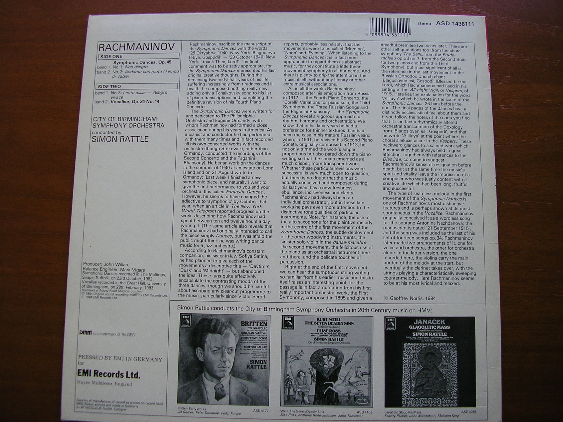 ASD 1436111  RACHMANINOV: VOCALISE / SYMPHONIC DANCES    SIMON RATTLE / CITY OF BIRMINGHAM SYMPHONY ORCHESTRA