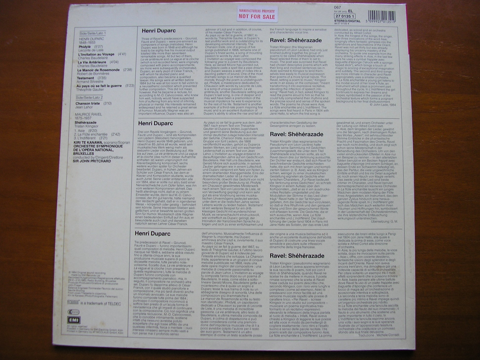 27 0135  RAVEL: SHEHERAZADE / DUPARC: SEVEN SONGS      KIRI TE KANAWA / BRUSSELS OPERA ORCHESTRA / SIR JOHN PRITCHARD