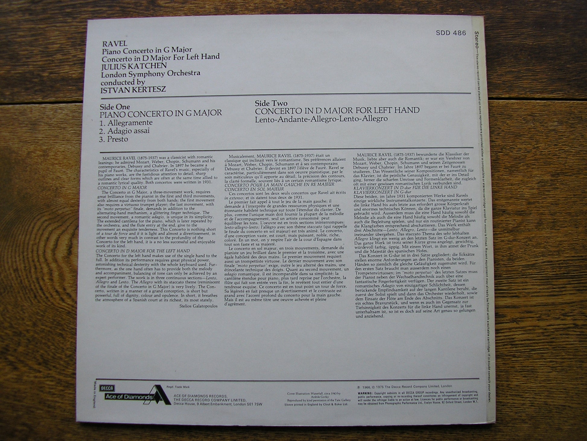 DECCA  ACE OF DIAMONDS  UK 1975  (G major recorded in 1966, Left Hand concerto in 1969). Re-issue of material from earlier SXLs, with the Left Hand concerto recut and now occupying a whole side and sounding better than ever.      NM / EX+