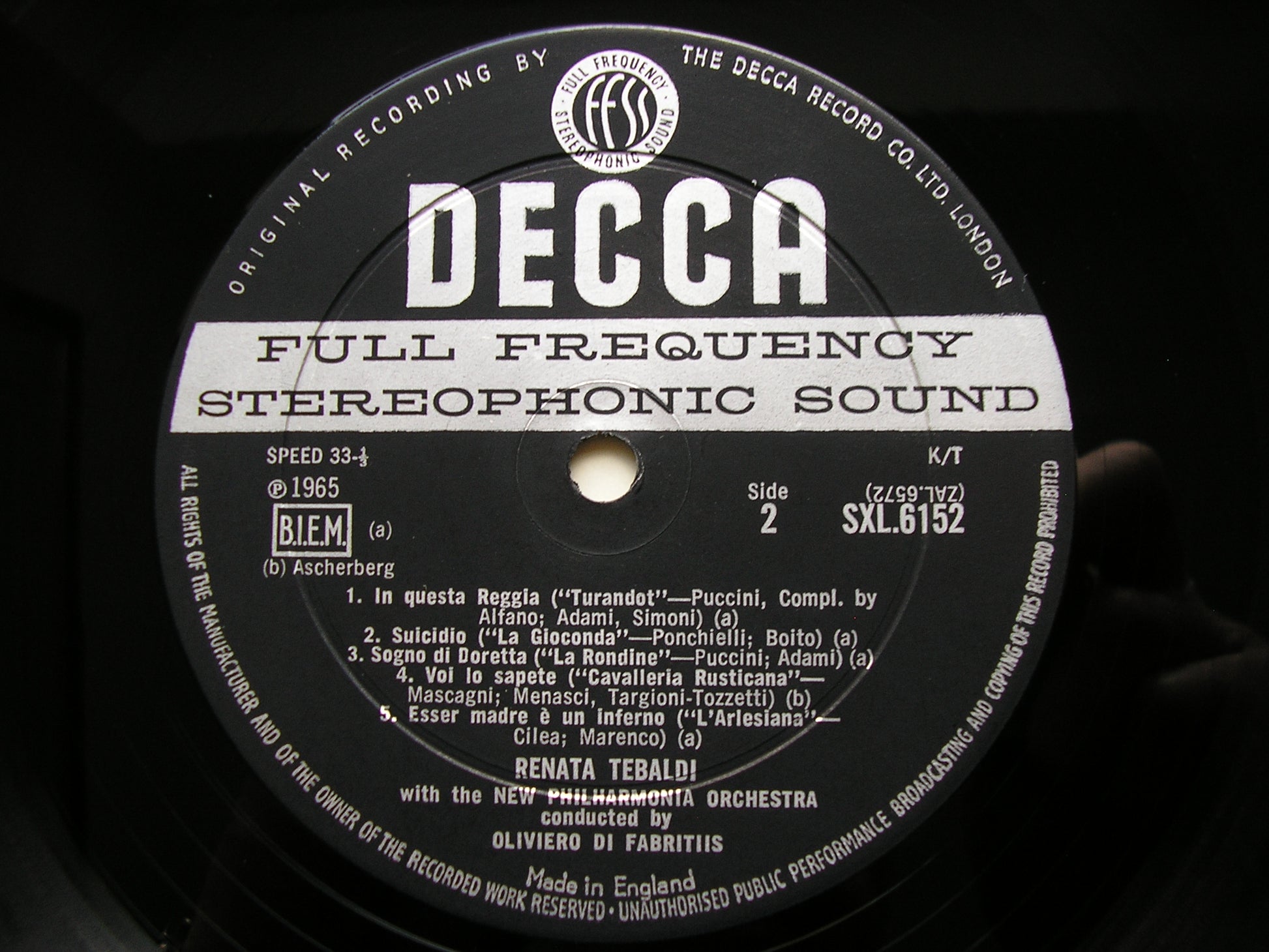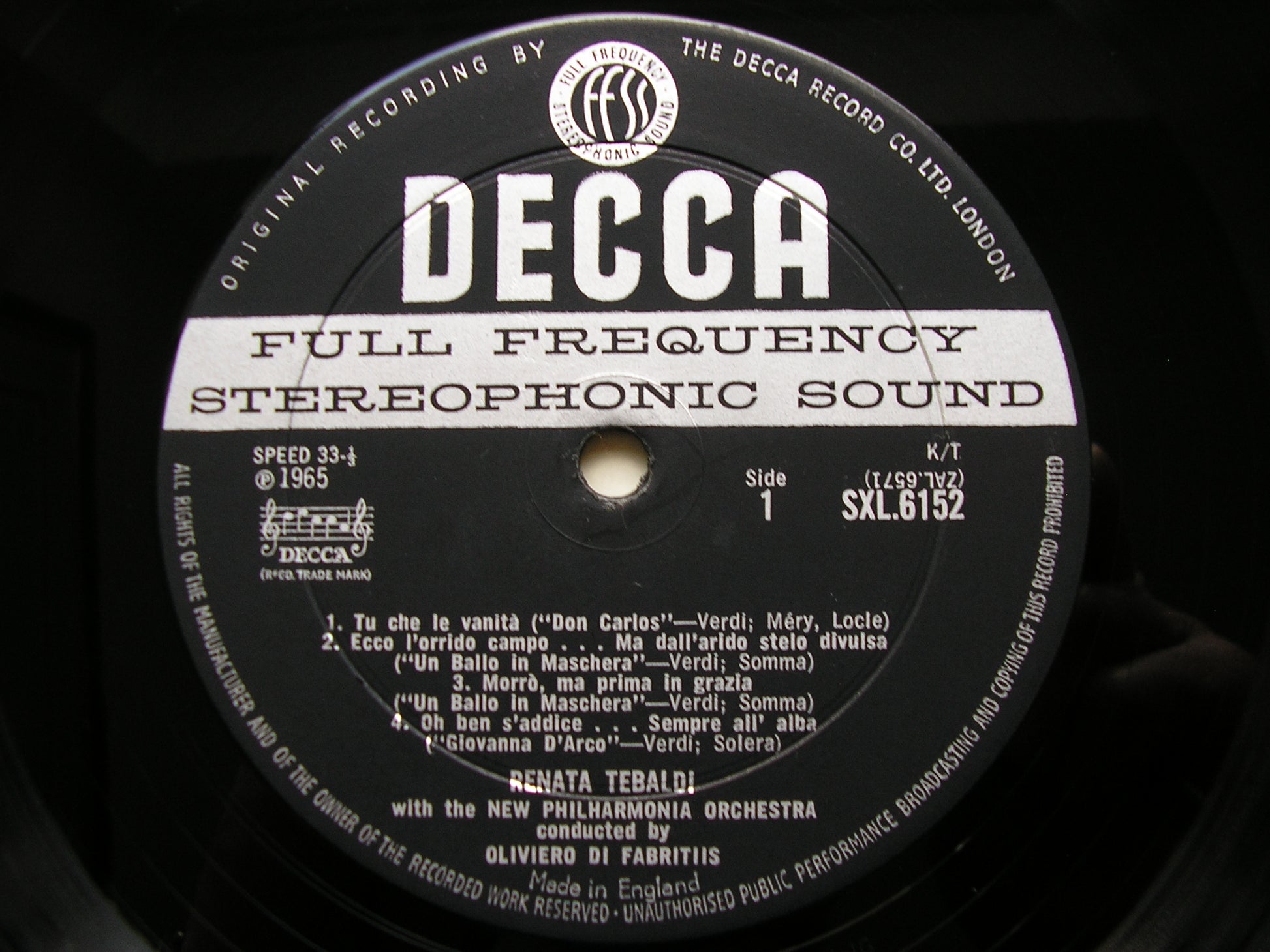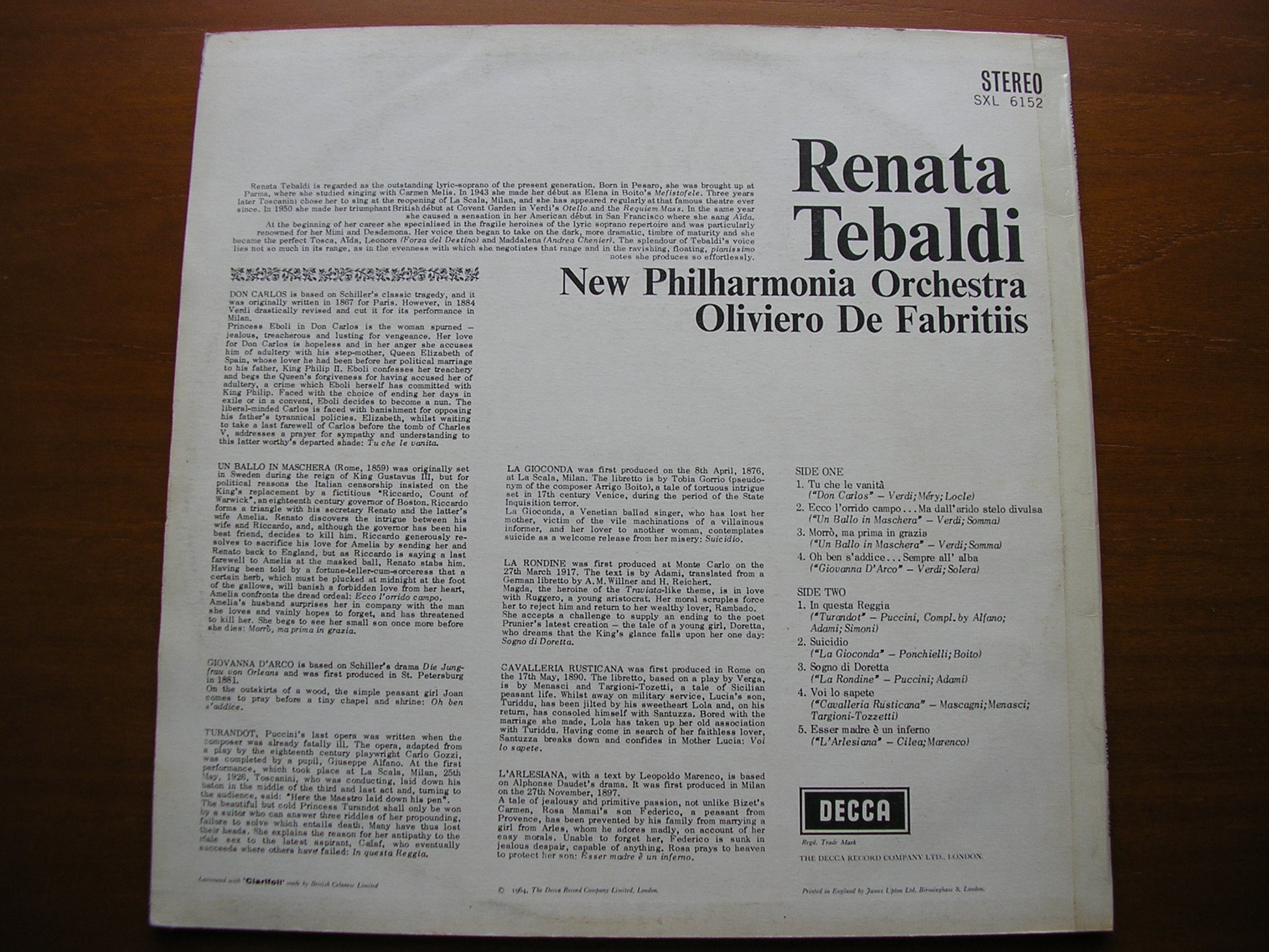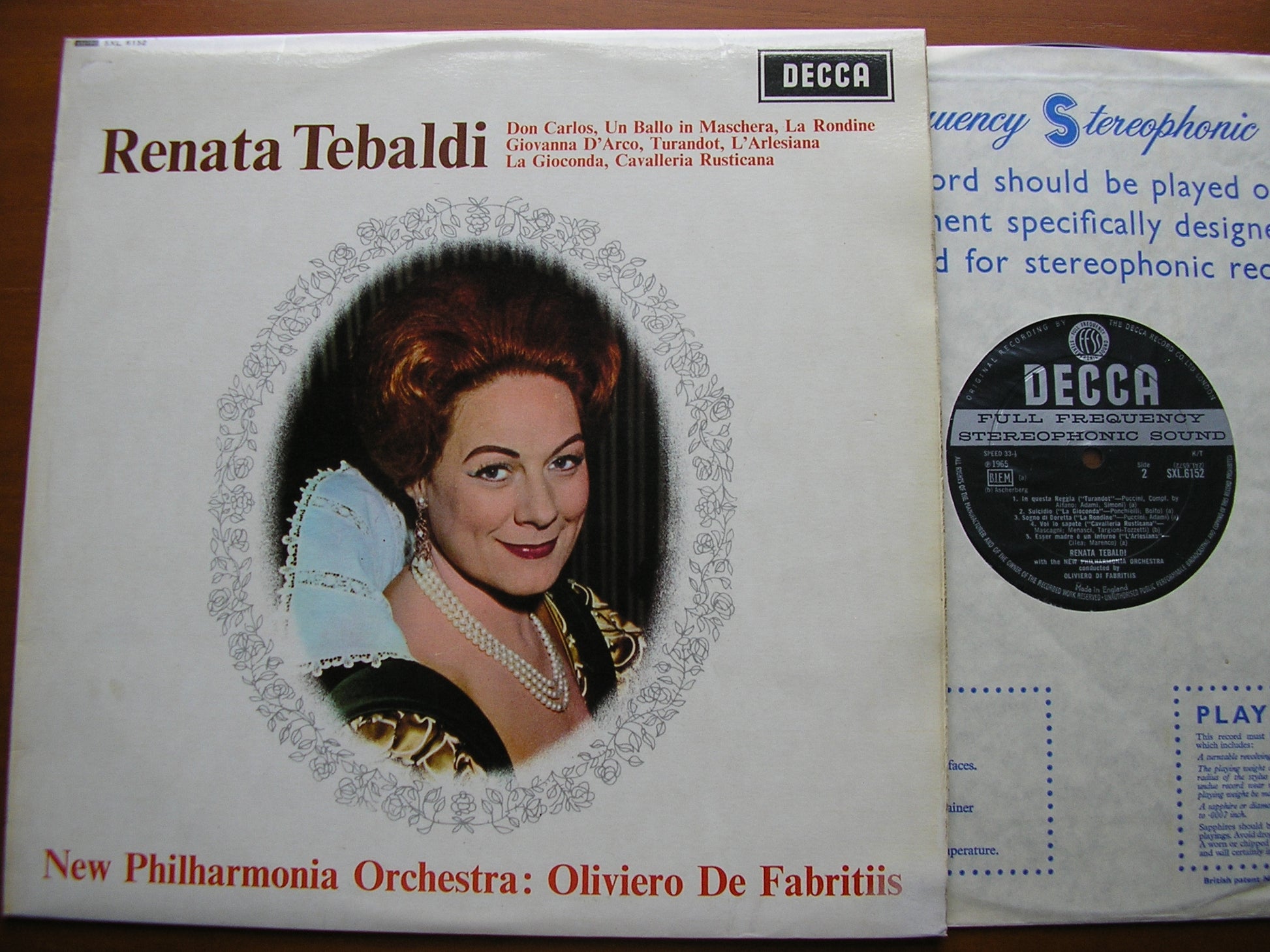 SXL 6152  OPERA ARIAS: VERDI Don Carlos / Un Ballo in Maschera / Giovanna D'Arco / PUCCINI Turandot / La Rondine / PONCHIELLI La Gioconda / MASCAGNI Cavalleria Rusticana / CILEA L'Arlesiana     RENATA TEBALDI / NEW PHILHARMONIA ORCHESTRA / OLIVIERO DE FABRITIIS