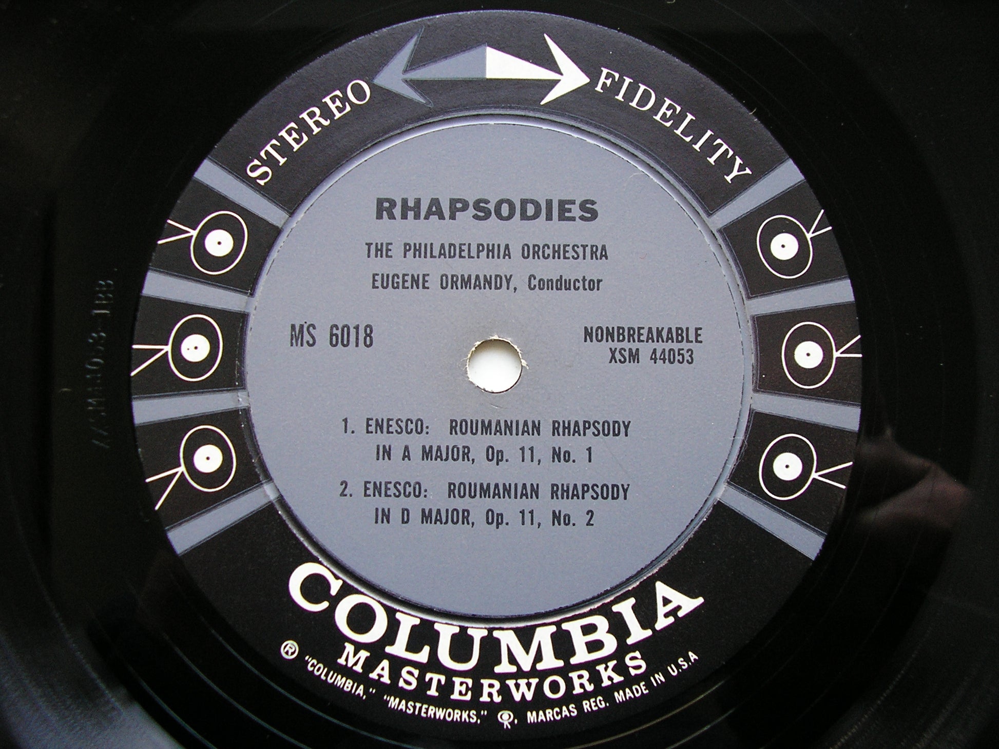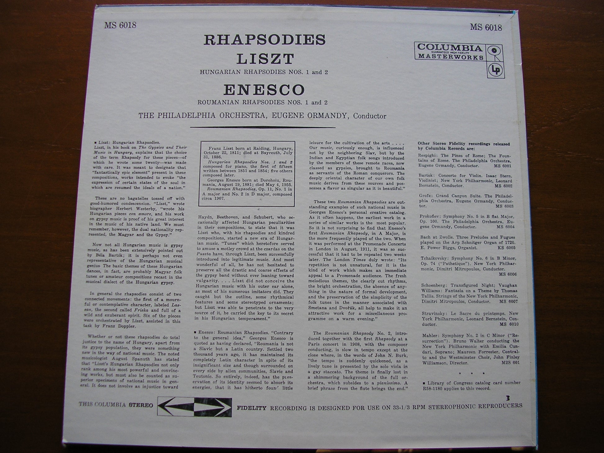 MS 6018  LISZT: HUNGARIAN RHAPSODIES Nos. 1 & 2 / ENESCO: ROUMANIAN RHAPSODIES Nos. 1 & 2   EUGENE ORMANDY / PHILADELPHIA ORCHESTRA