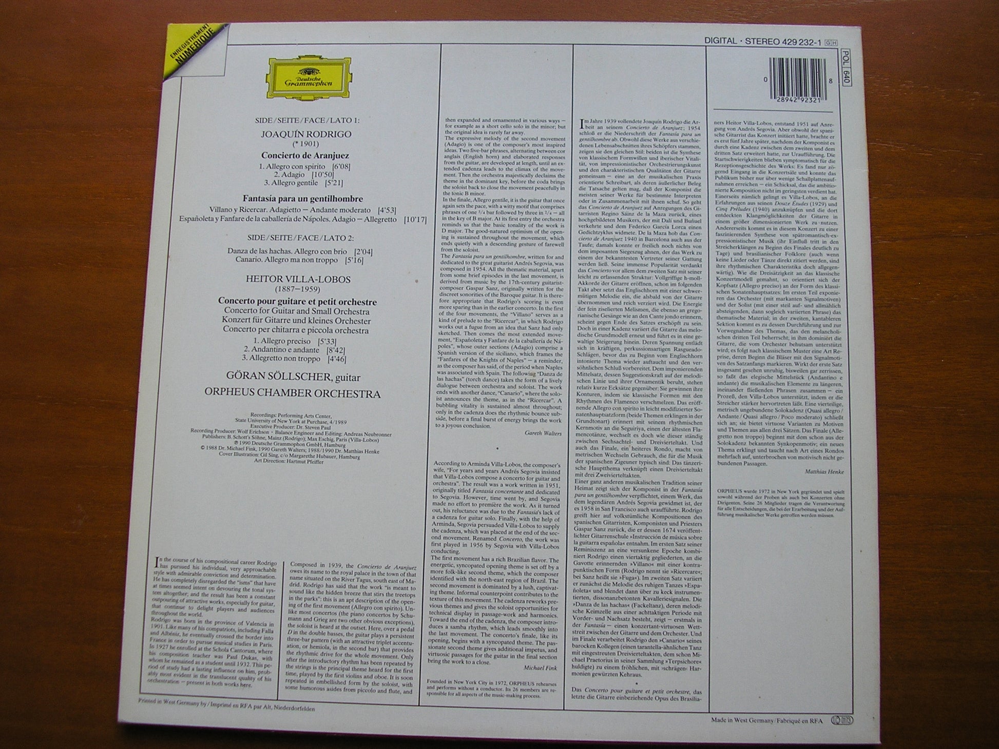 RODRIGO: CONCIERTO DE ARANJUEZ / FANTASIA PARA UN GENTILHOMBRE / VILLA-LOBOS: GUITAR CONCERTO SOLLSCHER / ORPHEUS CHAMBER ORCHESTRA 429 232