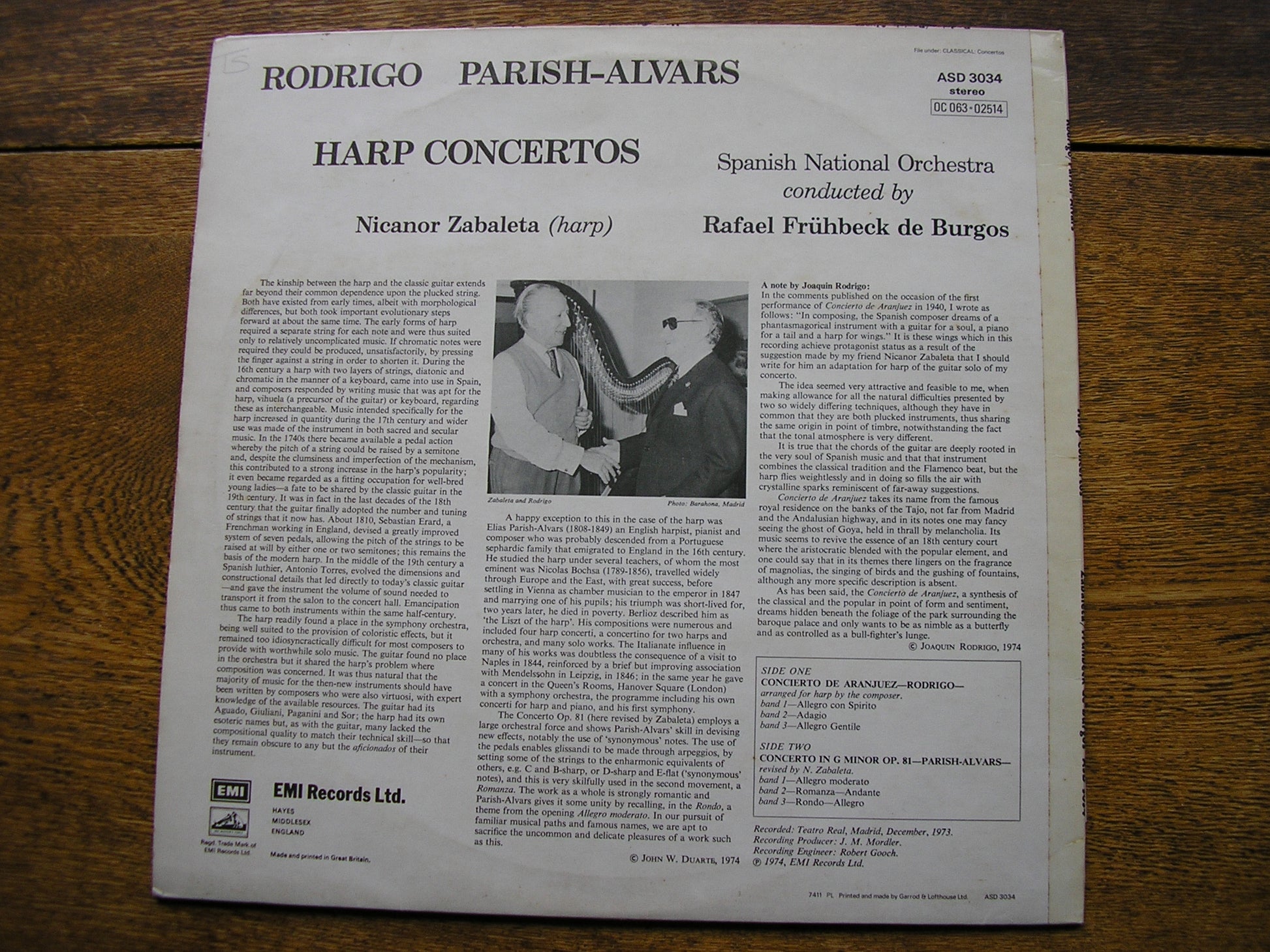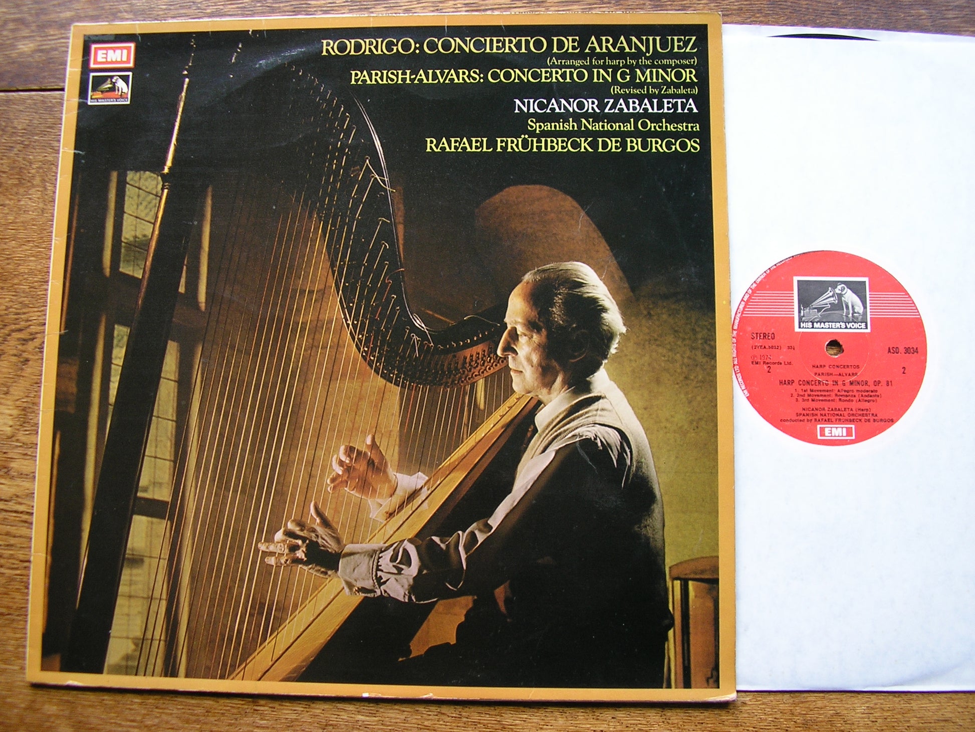 ASD 3034  RODRIGO: HARP CONCERTO (adapted from Concierto de Aranjuez)      PARISH - ALVARS: HARP CONCERTO Op. 81     NICANOR ZABALETA / SPANISH NATIONAL ORCHESTRA / RAFAEL FRUHBECK DE BURGOS