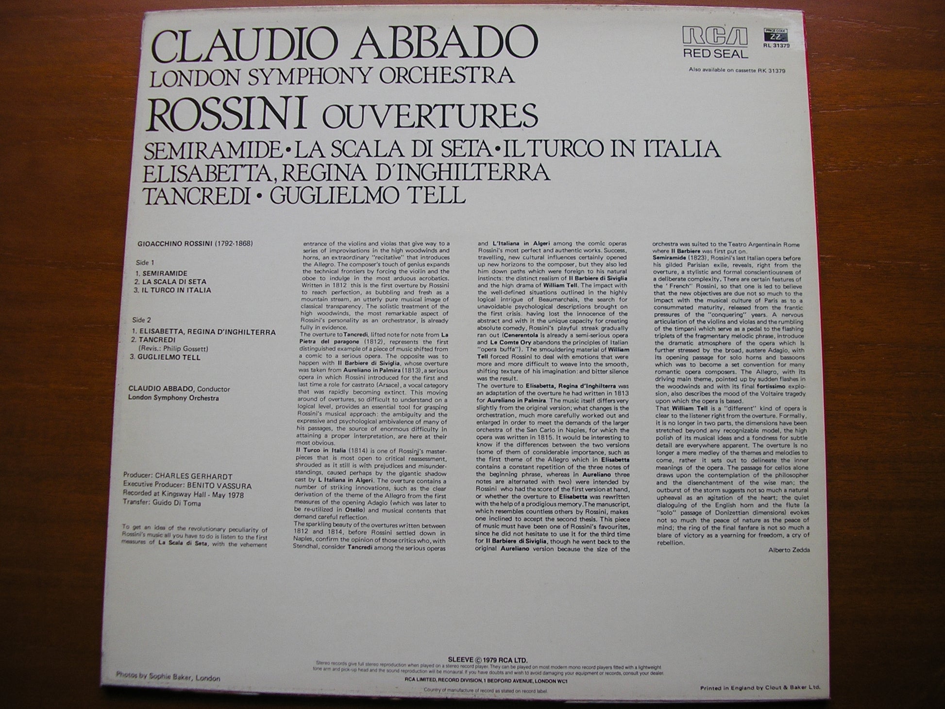 RL 31379  ROSSINI: OVERTURES Semiramide / William Tell / Tancredi / La Scala di Seta / Il Turco in Italia / Elisabetta, Regina D'Inghilterra     CLAUDIO ABBADO / LONDON SYMPHONY ORCHESTRA