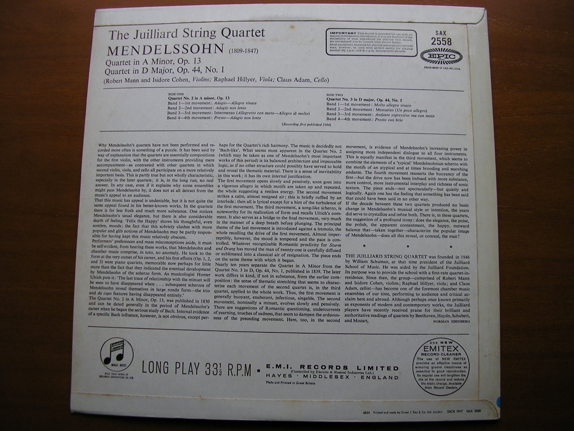 SAX 2558 MENDELSSOHN: STRING QUARTETS Nos. 2 & 3 THE JUILLIARD STRING QUARTET