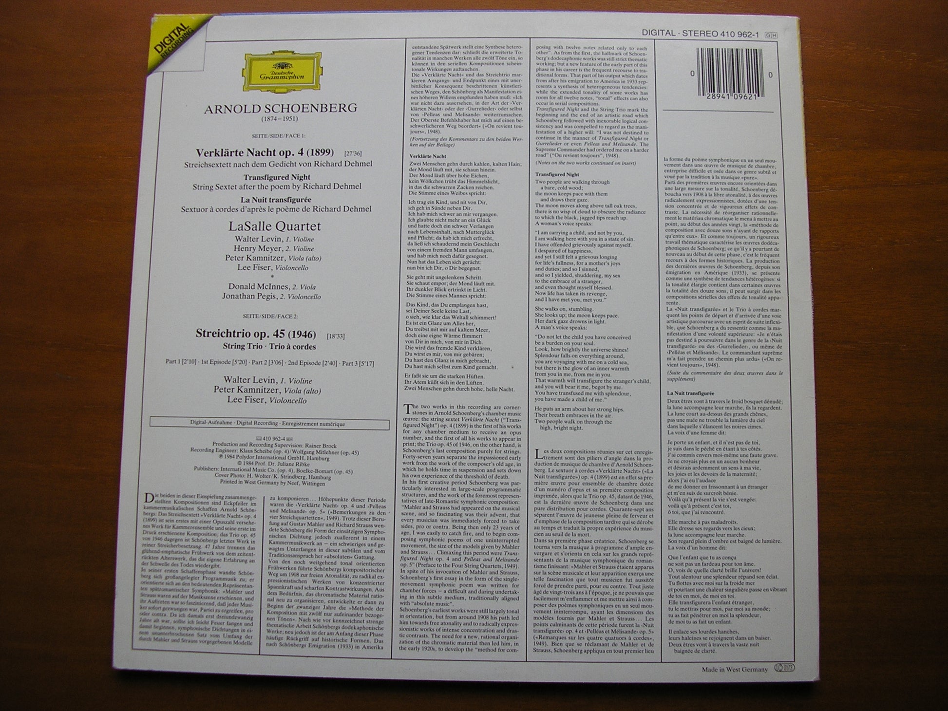 410 962  SCHOENBERG: TRANSFIGURED NIGHT / STRING TRIO     LASALLE QUARTET / DONALD McINNES / JONATHAN PEGIS
