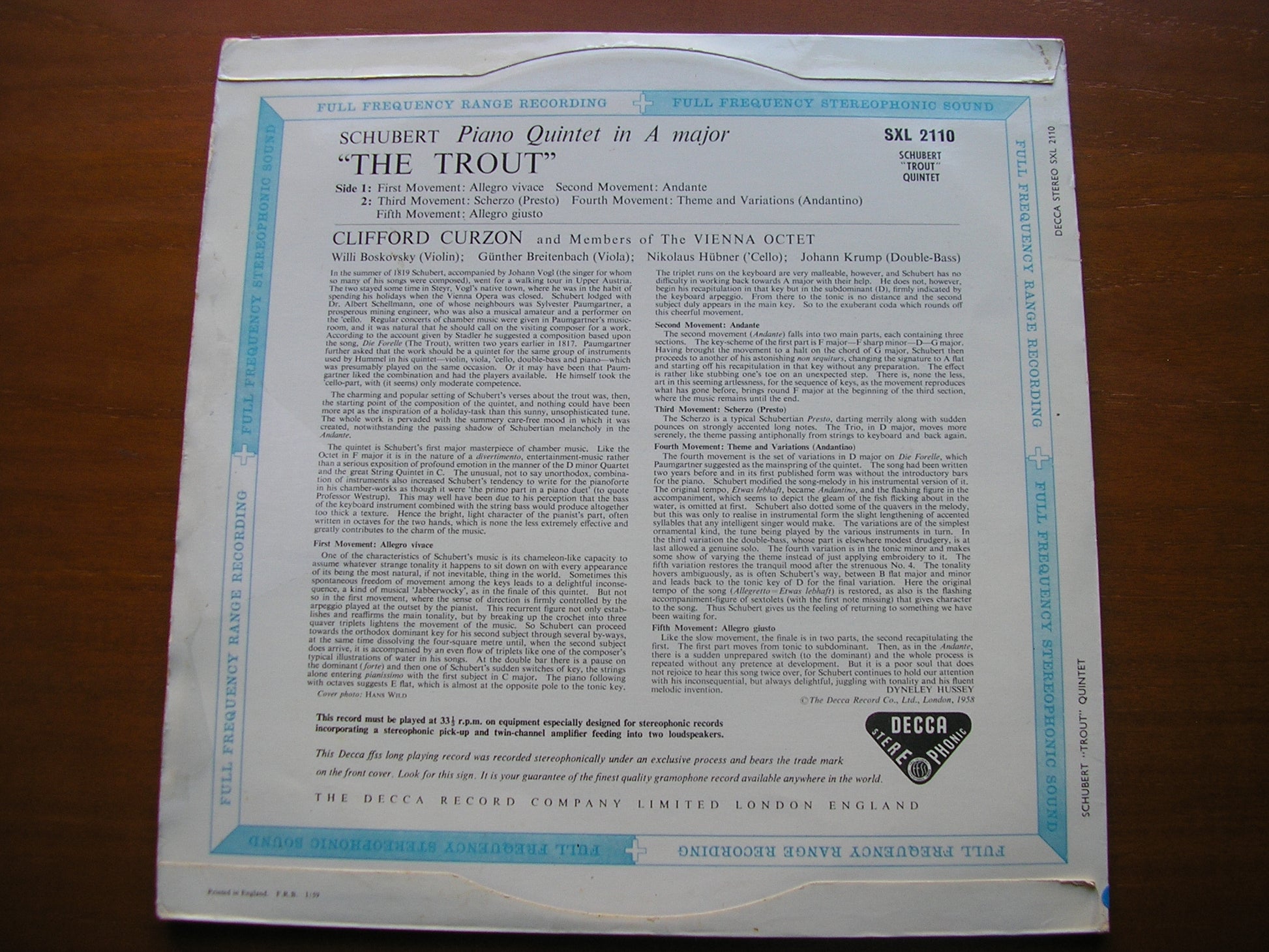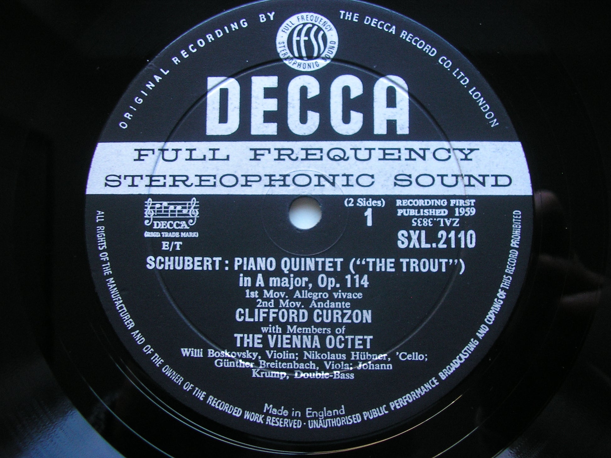 SXL 2110  SCHUBERT: PIANO QUINTET in A 'The Trout'    CLIFFORD CURZON / MEMBERS of THE VIENNA OCTET