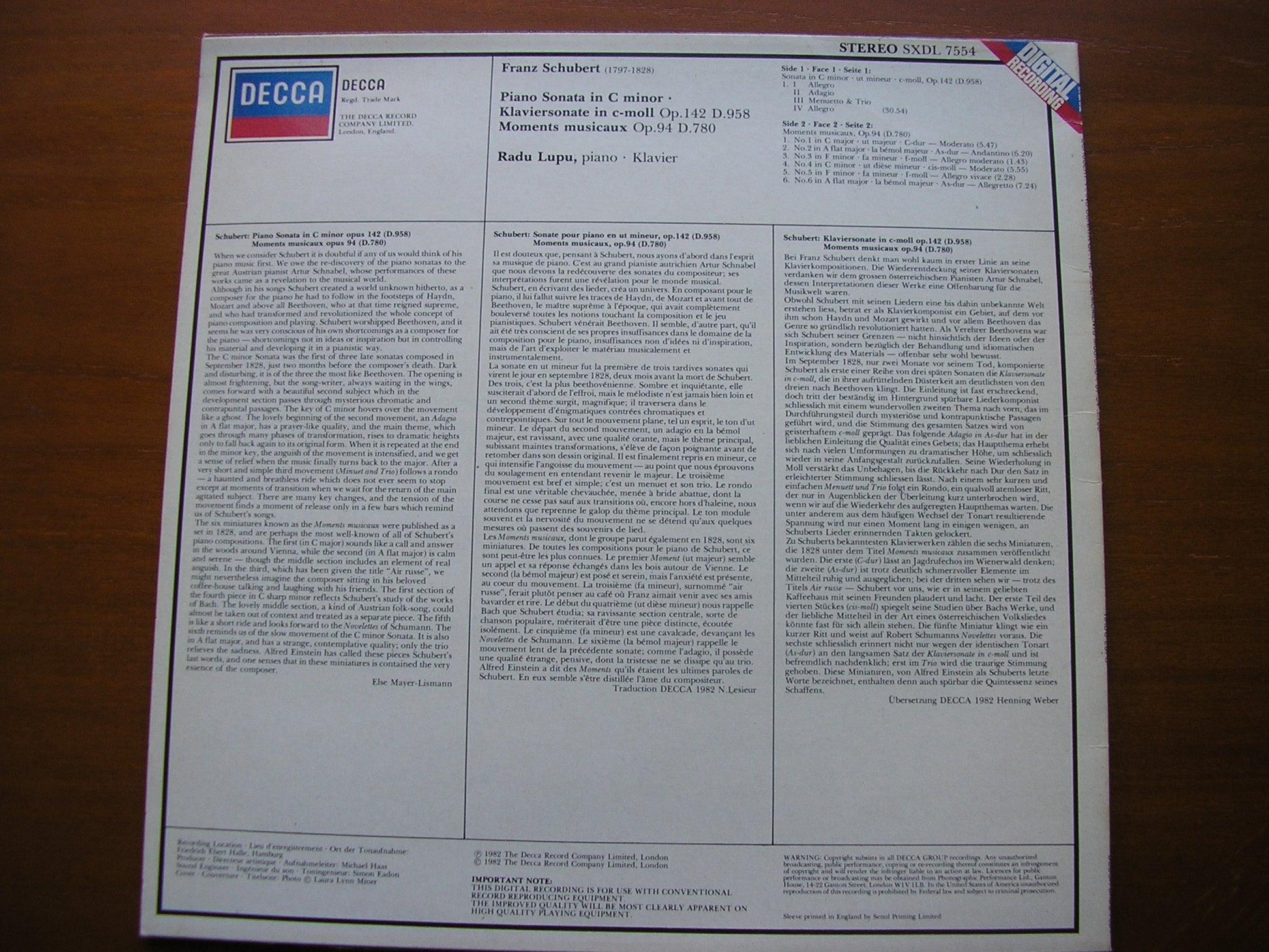SXDL 7554  SCHUBERT: SONATA in C  D.958 / MOMENTS MUSICAUX D.780      RADU LUPU
