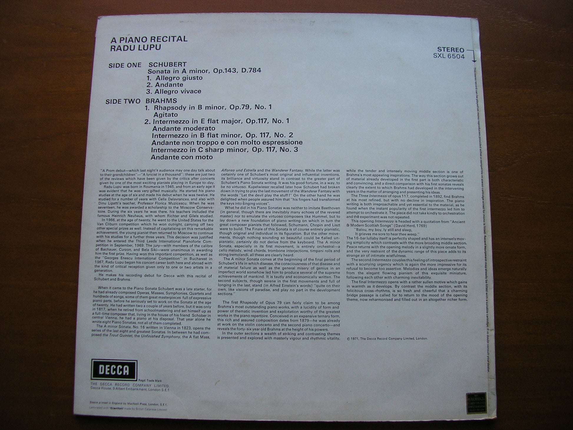 SXL 6504  SCHUBERT: SONATA in A  Op. 143 / BRAHMS: RHAPSODY No. 1 / 3 INTERMEZZI Op. 117   RADU LUPU