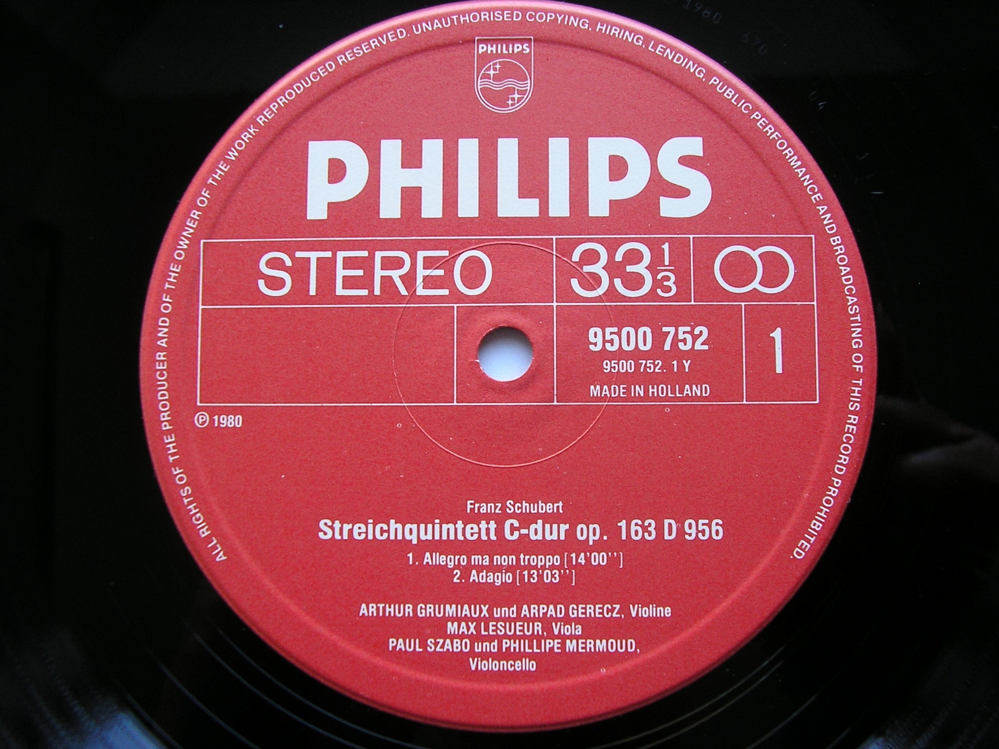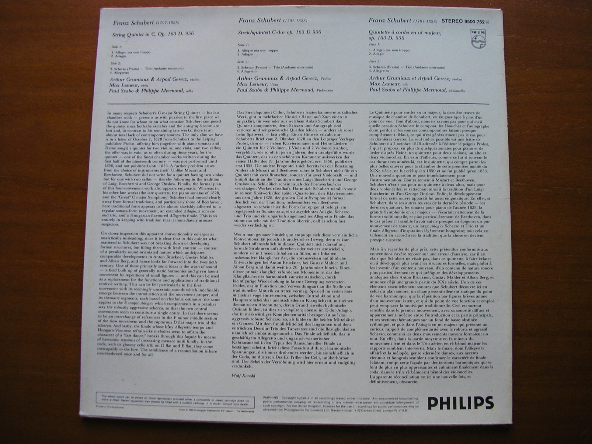 9500 752  SCHUBERT: STRING QUINTET D956      ARTHUR GRUMIAUX / ARPAD GERECZ / MAX LESUEUR / PAUL SZABO / PHILLIPE MERMOUD