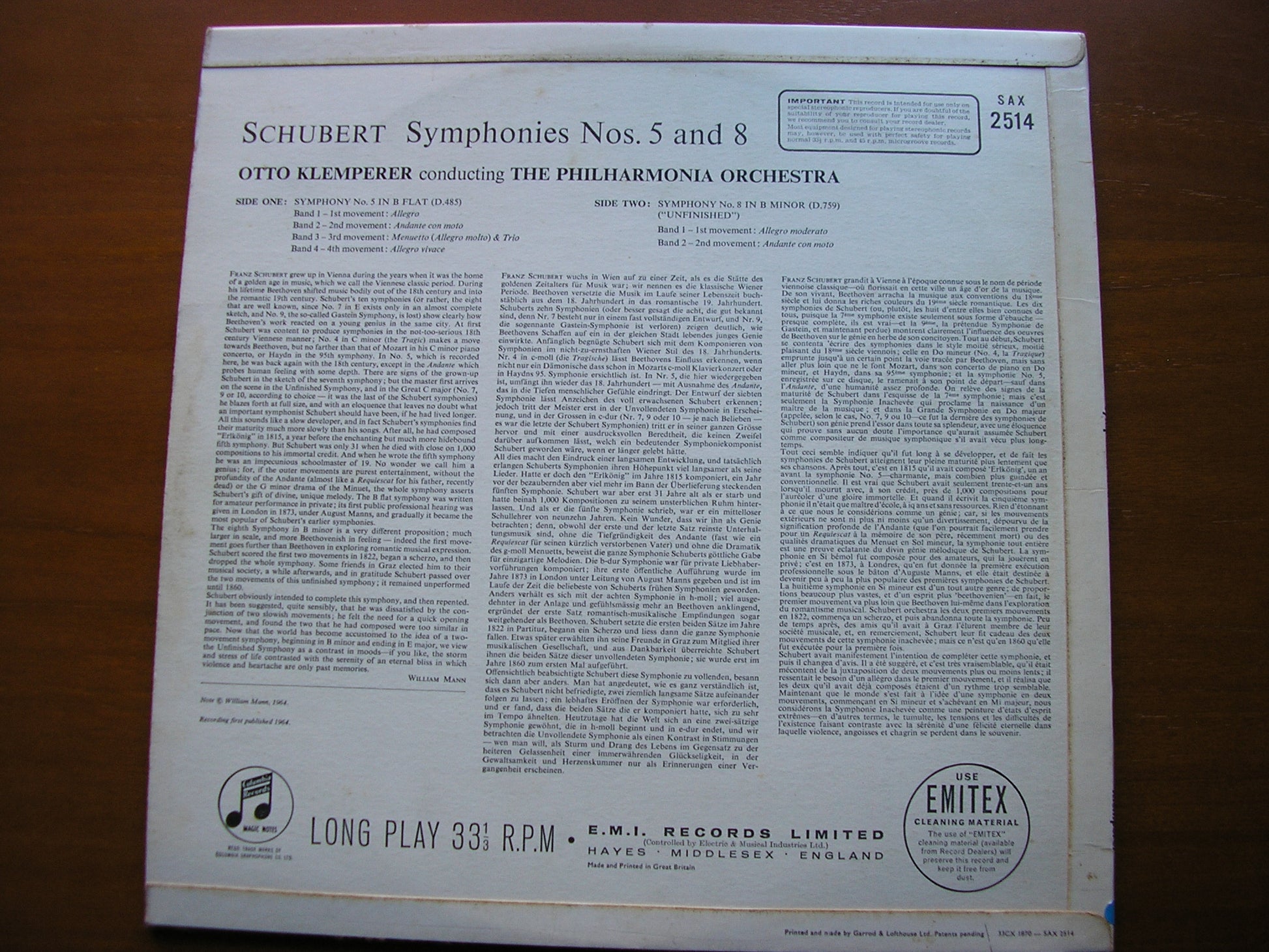 SAX 2514 SCHUBERT: SYMPHONIES Nos. 5 & 8 PHILHARMONIA / KLEMPERER