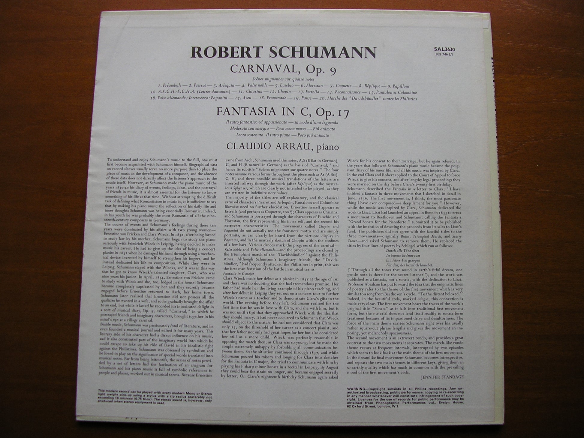 SCHUMANN: CARNAVAL Op. 9 / FANTASIA Op. 17 CLAUDIO ARRAU SAL 3630