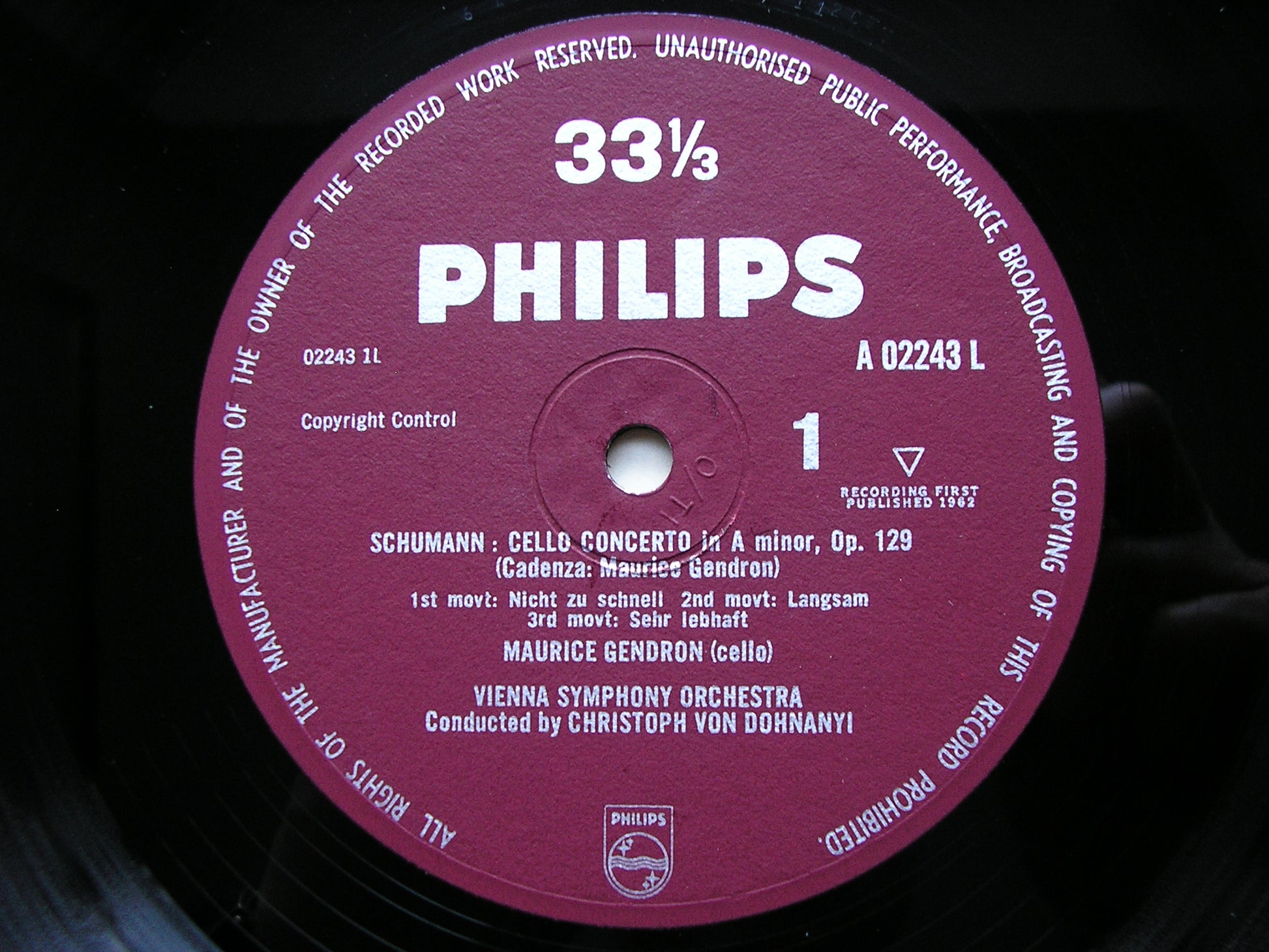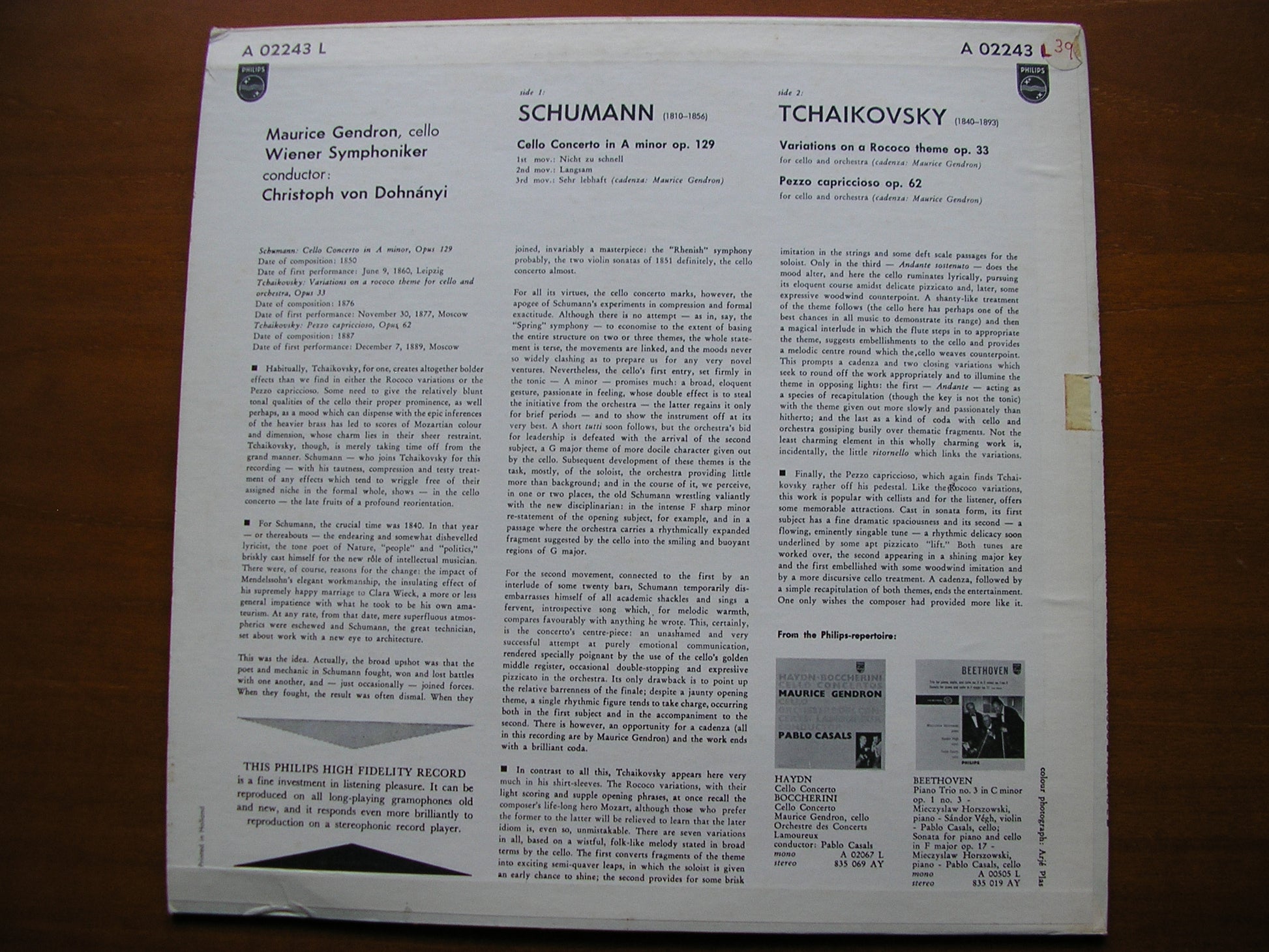 A 02243  SCHUMANN: CELLO CONCERTO / TCHAIKOVSKY: ROCOCO VARIATIONS / PEZZO CAPRICCIOSO     MAURICE GENDRON / VIENNA SYMPHONY ORCHESTRA / CHRISTOPH VON DOHNANYI