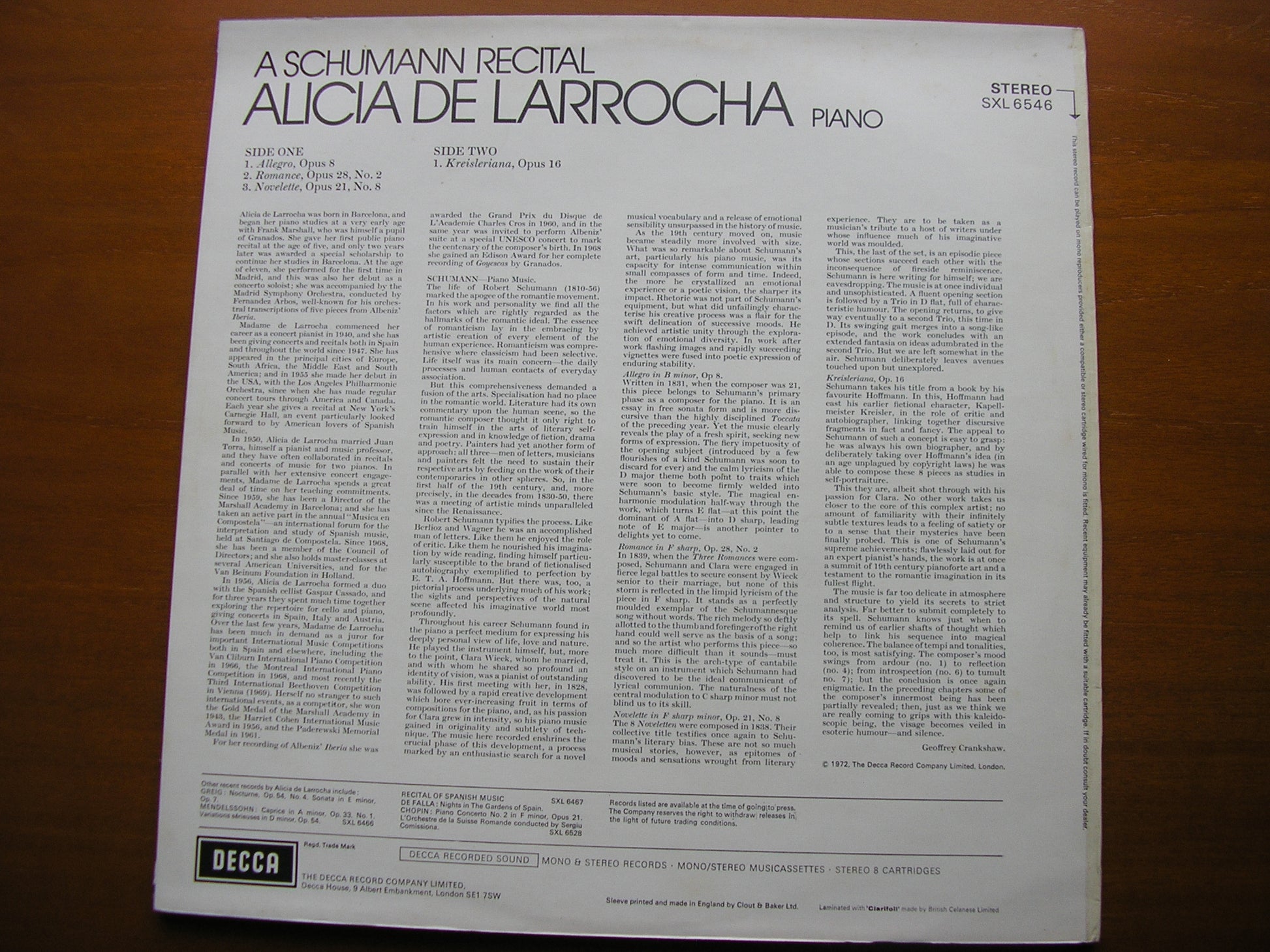 SXL 6546  SCHUMANN: KREISLERIANA / ALLEGRO / ROMANCE / NOVELETTE       ALICIA DE LARROCHA