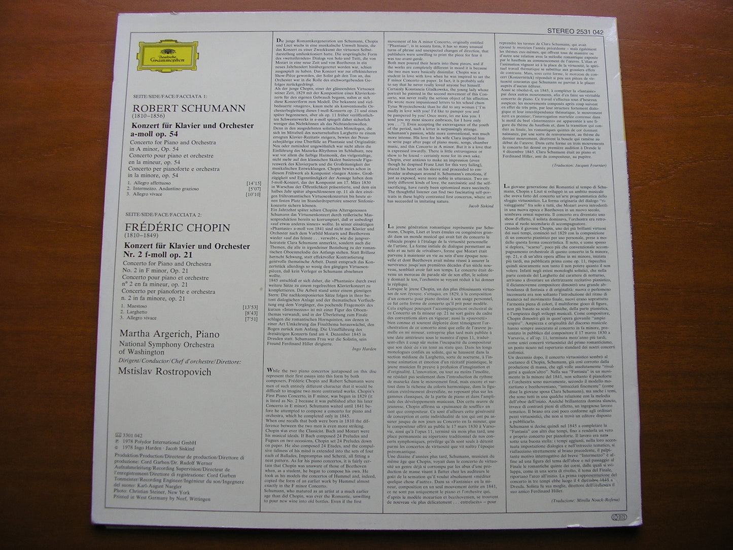 2531 042  SCHUMANN & CHOPIN: PIANO CONCERTOS    MARTHA ARGERICH / MSTISLAV ROSTROPOVICH / NATIONAL SYMPHONY ORCHESTRA OF WASHINGTON DC