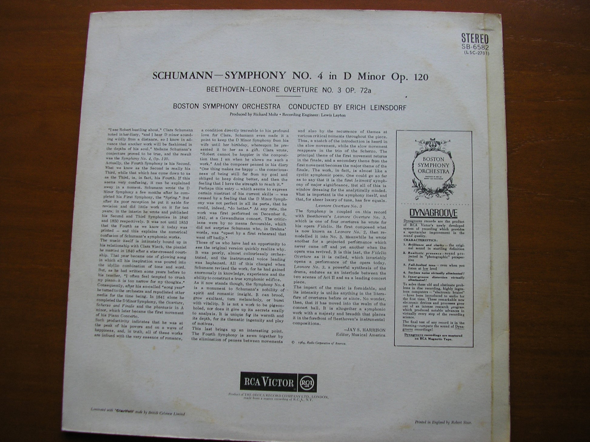 SB 6582  SCHUMANN: SYMPHONY NO. 4 / BEETHOVEN: LEONORA No. 3    ERICH LEINSDORF / BOSTON SYMPHONY ORCHESTRA