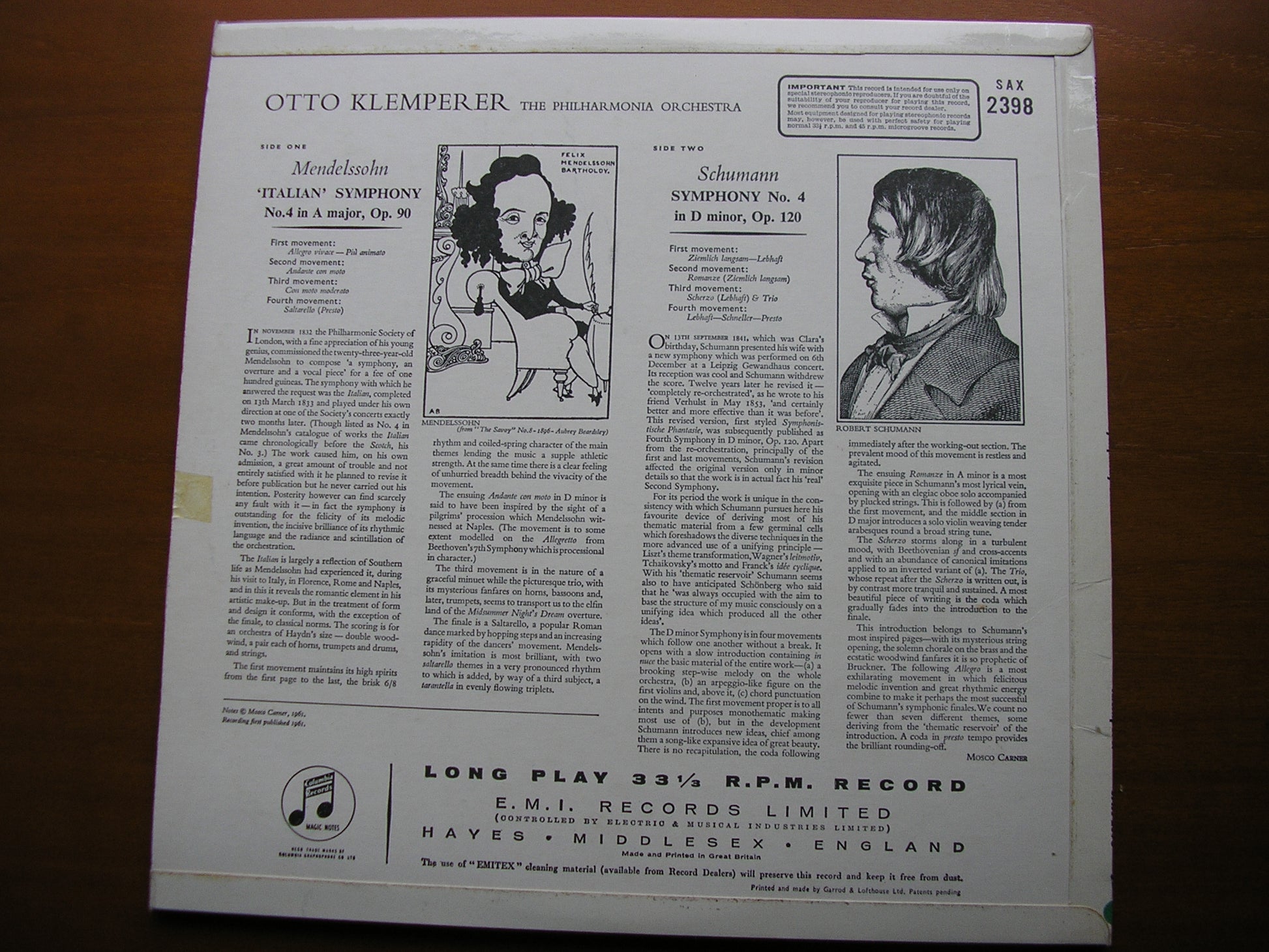 SAX 2398  SCHUMANN: SYMPHONY No. 4 / MENDELSSOHN: SYMPHONY No. 4     OTTO KLEMPERER / PHILHARMONIA ORCHESTRA