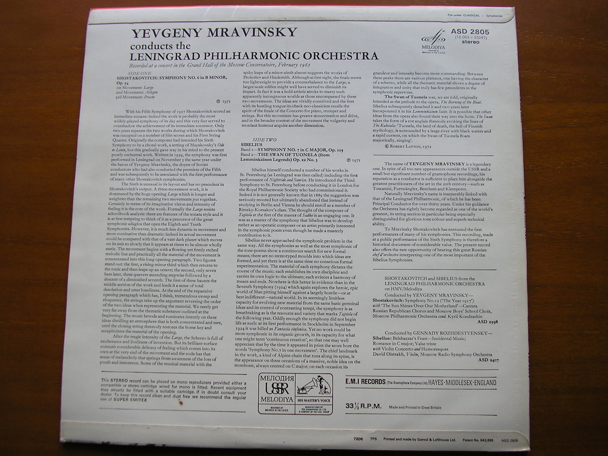 ASD 2805  SHOSTAKOVICH: SYMPHONY No. 6 / SIBELIUS: SYMPHONY No. 7    YEVGENY MRAVINSKY / LENINGRAD SYMPHONY ORCHESTRA