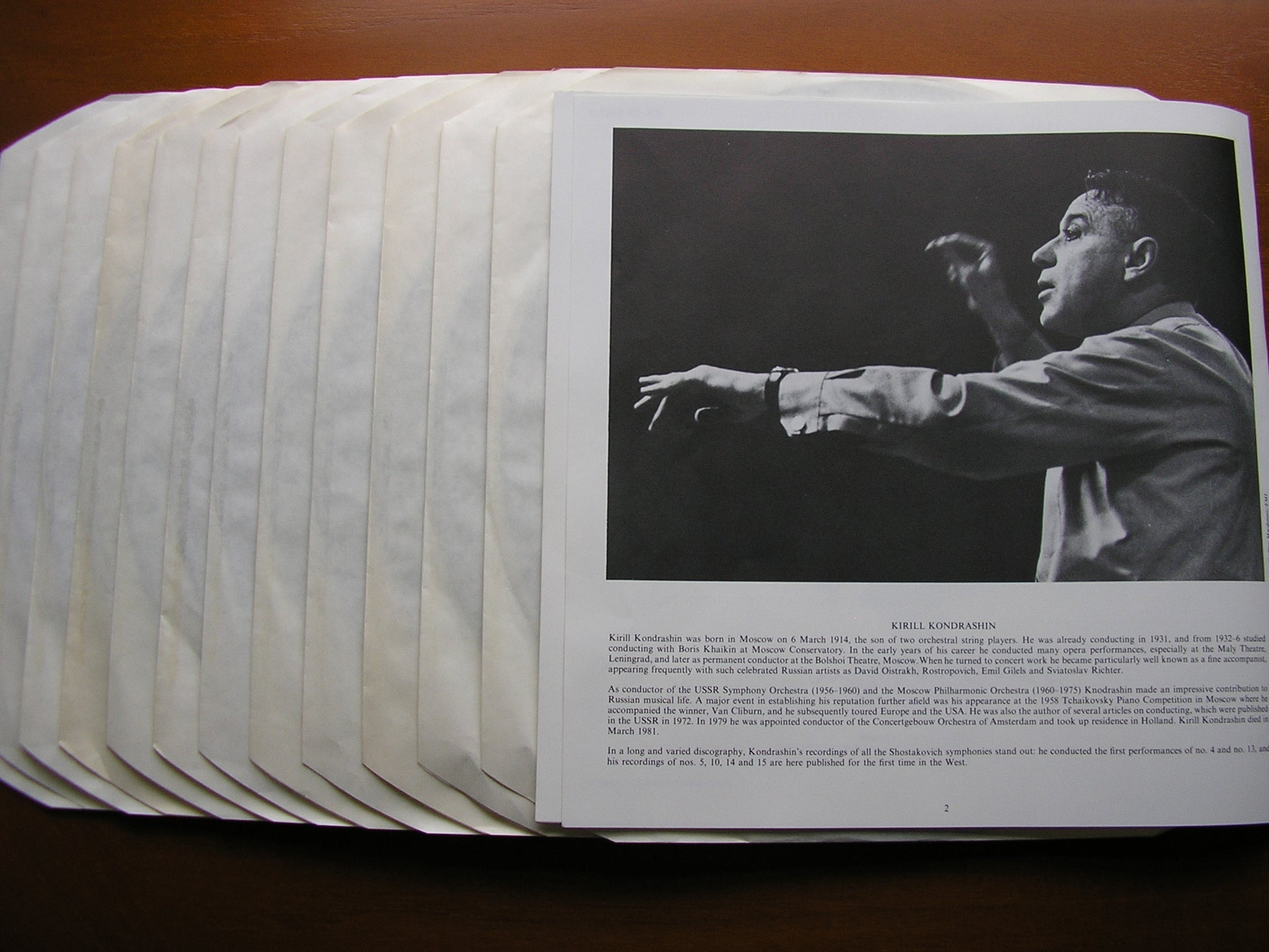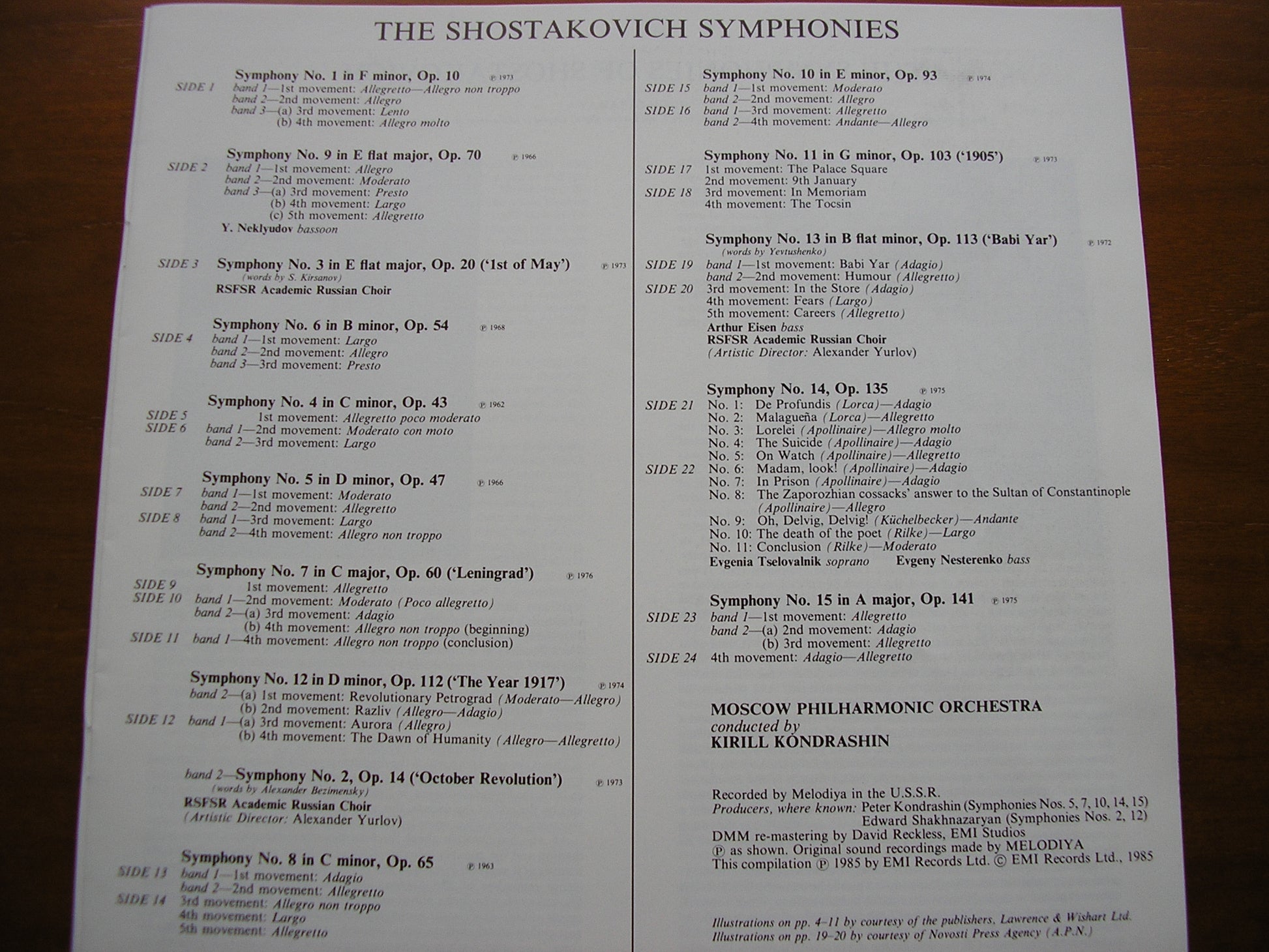 THIS 1985 SET HAS KONDRASHIN'S INTERPRETATIONS  OF THE WHOLE CYCLE AND INCLUDES THE FIRST PUBLICATION IN THE WEST OF HIS RECORDINGS OF SYMPHONIES Nos. 5 / 10 / 14 & 15.