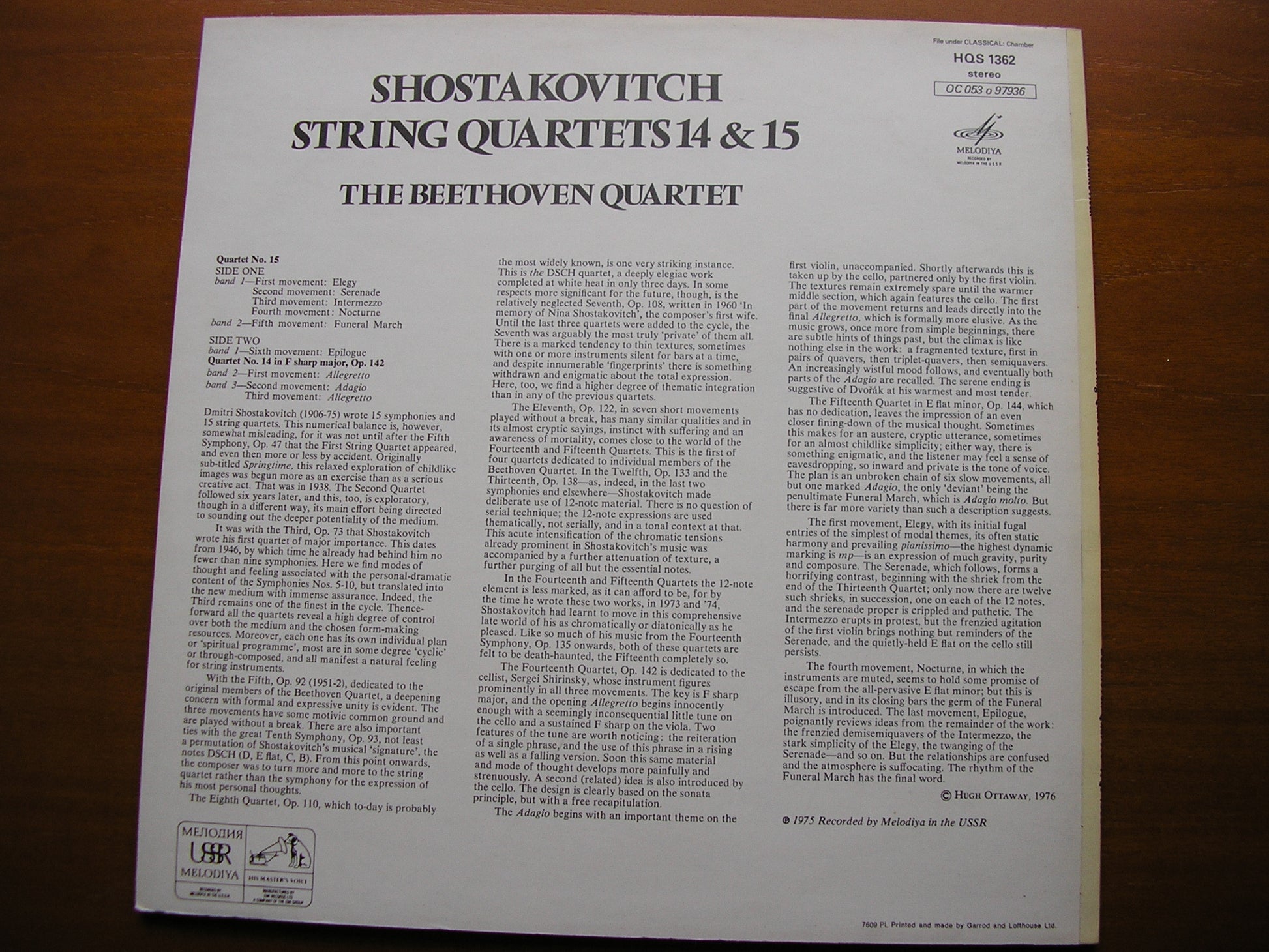 The last two string quartets, nos. 14 Op. 142 and 15 Op. 144 were composed in 1973 and 1974, too late for inclusion in the 'complete' survey of the Shostakovich String Quartets published as a box set in 1973. The Borodin Quartet having temporarily ceased performing in public pending the assimilation of new members, Russia's youthful Beethoven Quartet were chosen by Melodiya to record the composer's final essays in the form and the recording was published in 1975, the cycle duly completed.