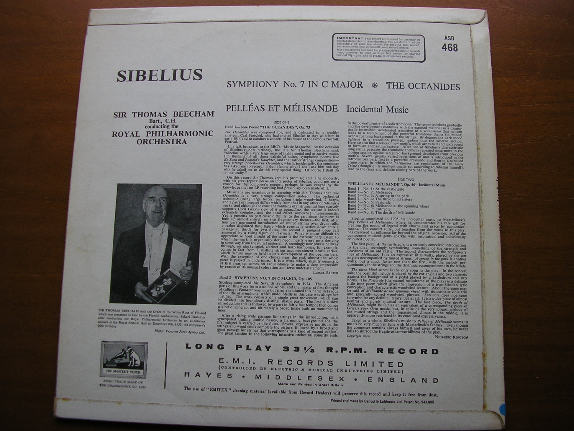 ASD 468  SIBELIUS: SYMPHONY No. 7 / PELLEAS & MELISANDE / THE OCEANIDES   SIR THOMAS BEECHAM / ROYAL PHILHARMONIC ORCHESTRA