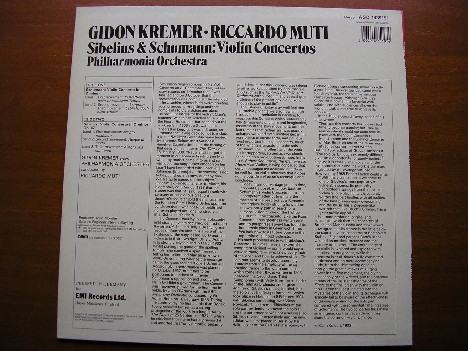 ASD 1435191  SIBELIUS: VIOLIN CONCERTO / SCHUMANN: VIOLIN CONCERTO    GIDON KREMER / PHILHARMONIA ORCHESTRA / RICCARDO MUTI