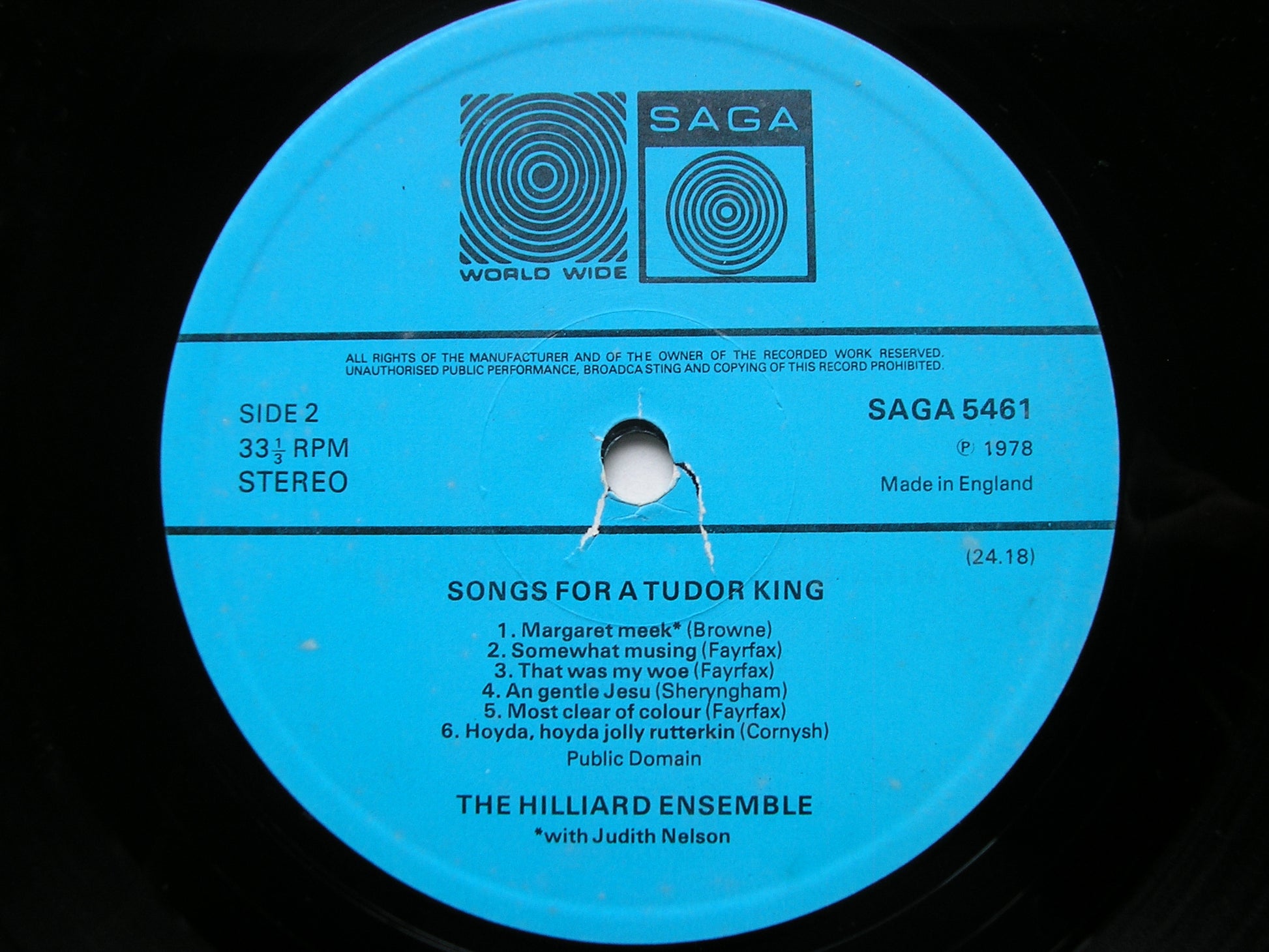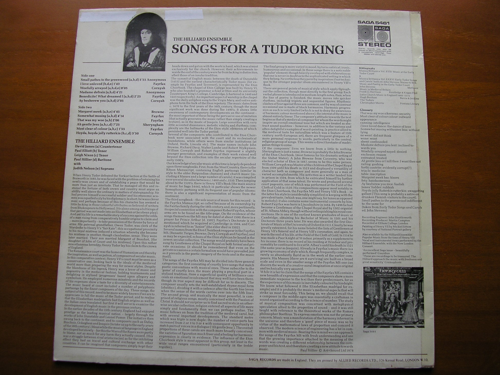 SAGA 5461  SONGS FOR A TUDOR KING: FAYRFAX / CORNYSH / BROWNE / SHERYNGHAM   JUDITH NELSON / THE HILLIARD ENSEMBLE / PAUL HILLIER