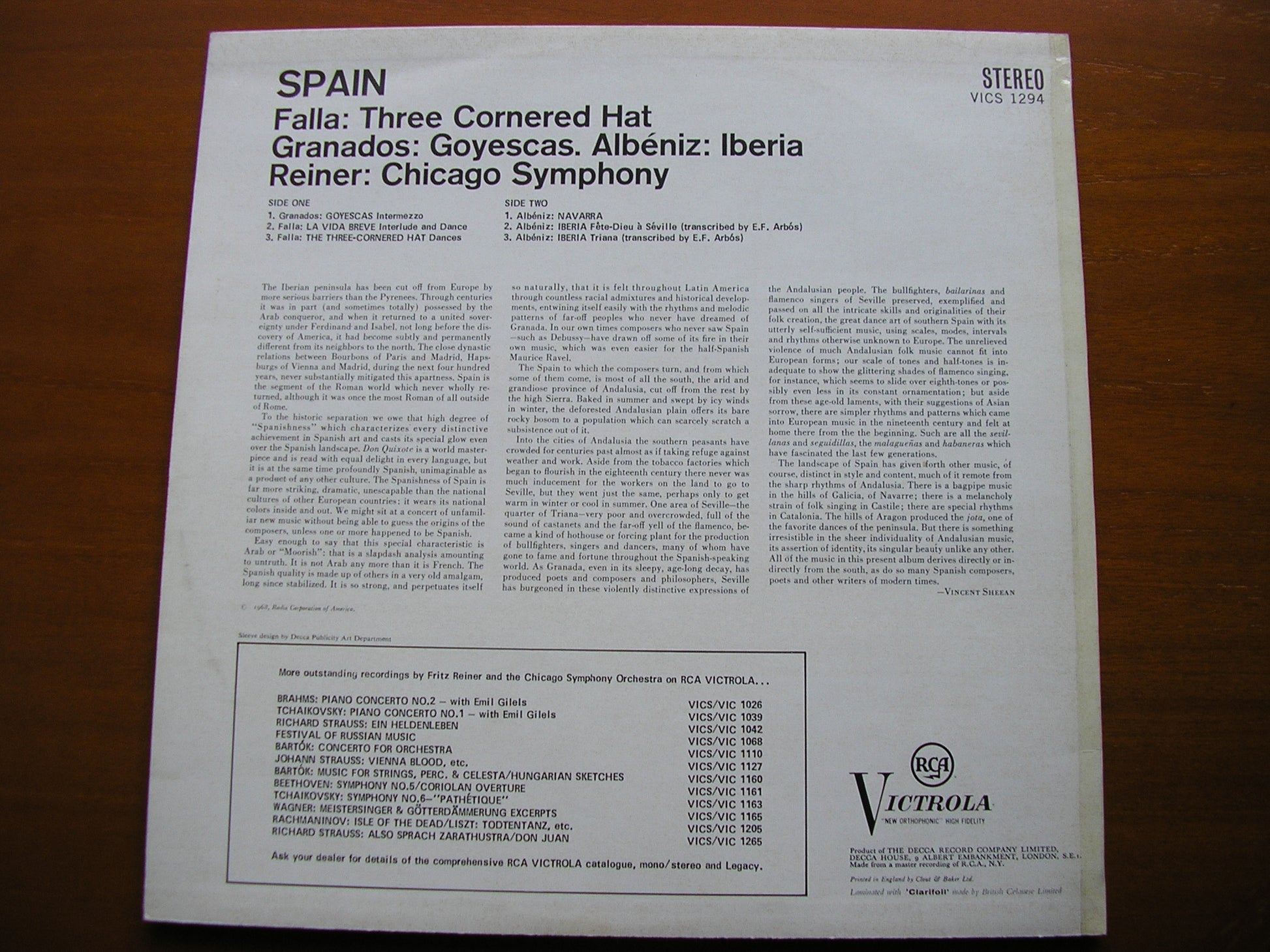 SPAIN: ORCHESTRAL MUSIC BY FALLA / GRANADOS / ALBENIZ REINER / CHICAGO SYMPHONY VICS 1294