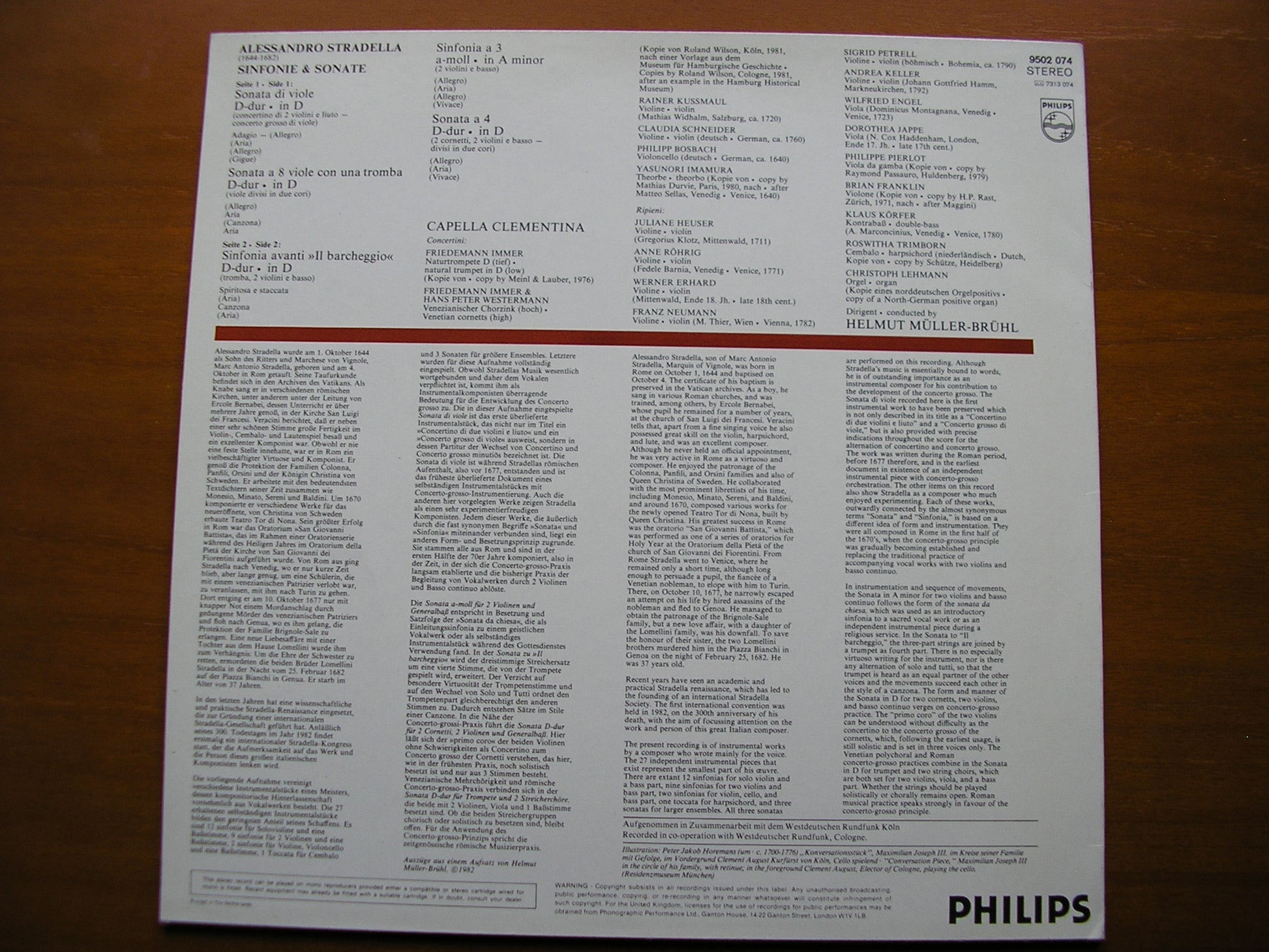 9502 074  ALESSANDRO STRADELLA: TWO SINFONIE / THREE SONATE       FRIEDEMANN IMMER / HANS PETER WESTERMANN / CAPELLA CLEMENTINA / HELMUT MULLER-BRUHL