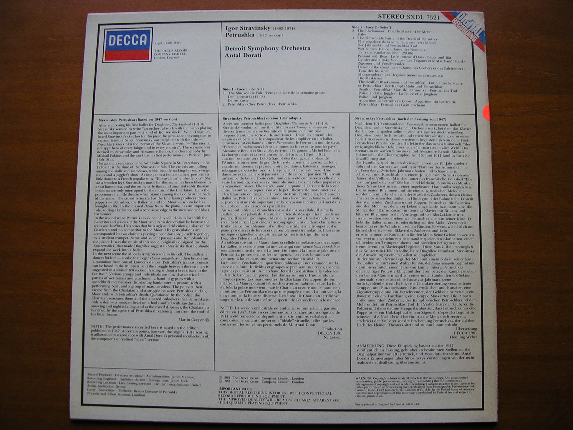 SXDL 7521  STRAVINSKY: PETRUSHKA     ANTAL DORATI / DETROIT SYMPHONY ORCHESTRA