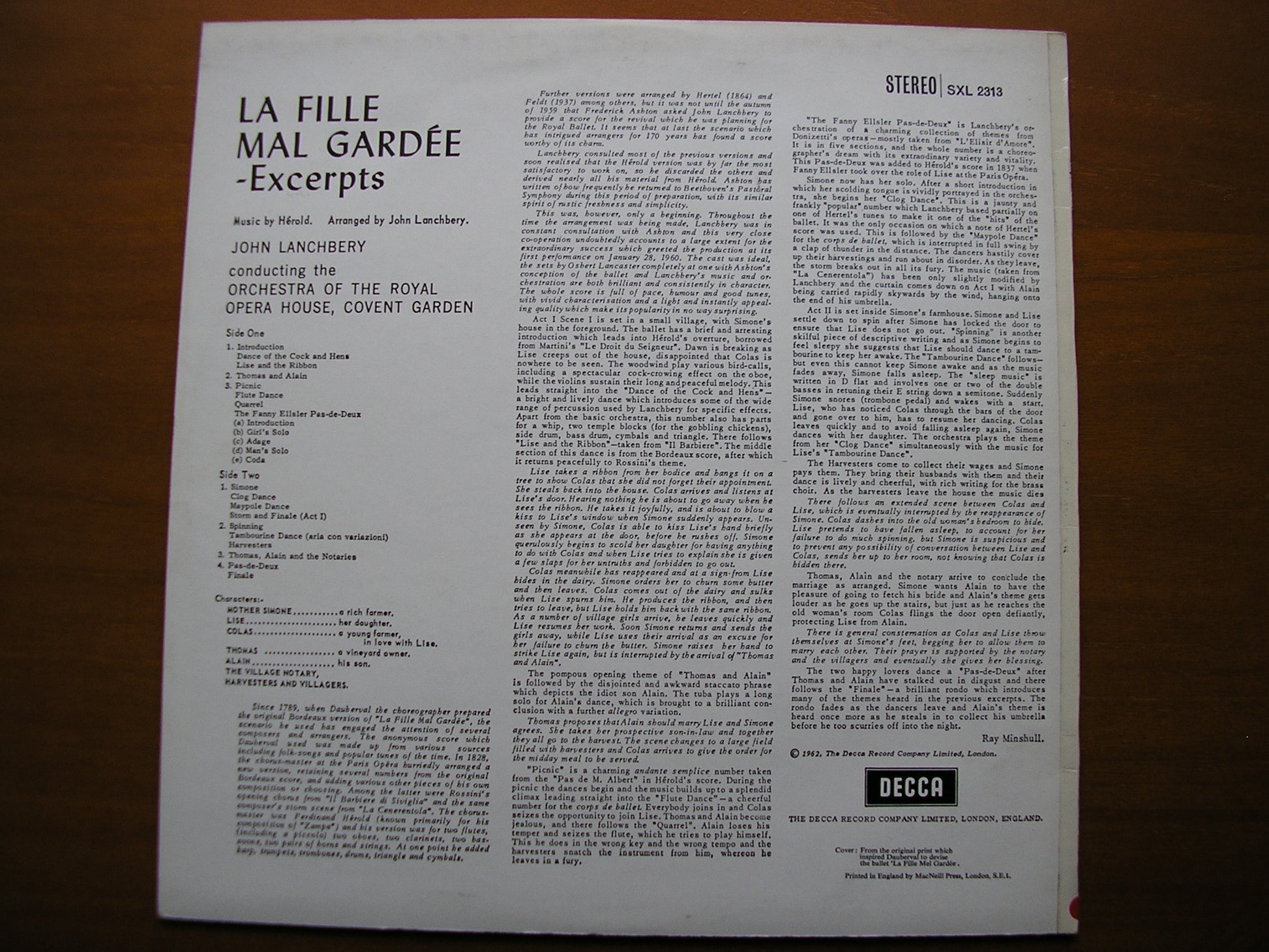 SXL 2313  HEROLD: LA FILLE MAL GARDEE    JOHN LANCHBERY / ORCHESTRA OF THE ROYAL OPERA HOUSE COVENT GARDEN