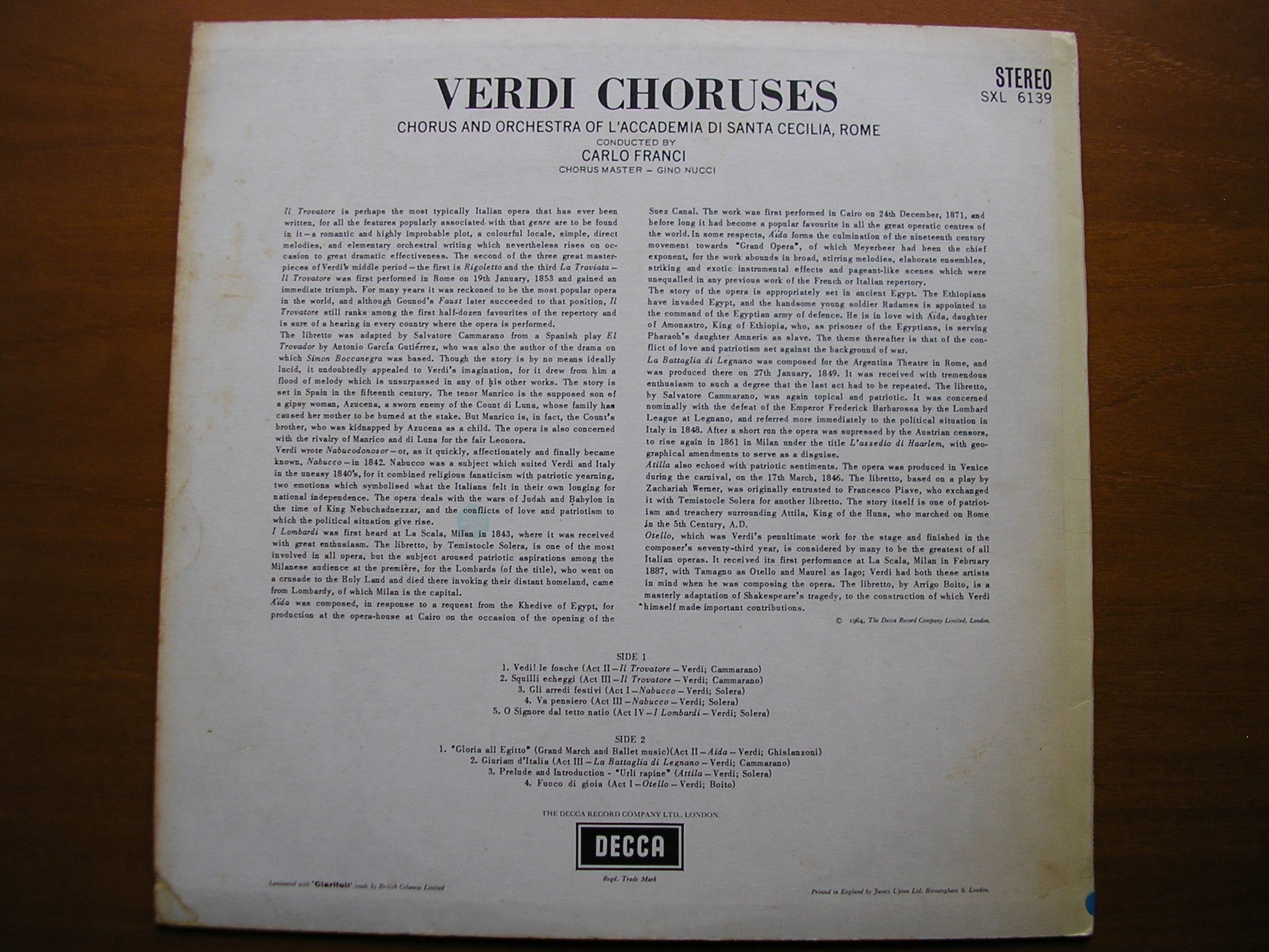 SXL 6139 VERDI: CHORUSES from NABUCCO / AIDA / TROVATORE / OTELLO / ATTILA / LOMBARDI      CARLO FRANCI / ACCADEMIA DI SANTA CECILIA