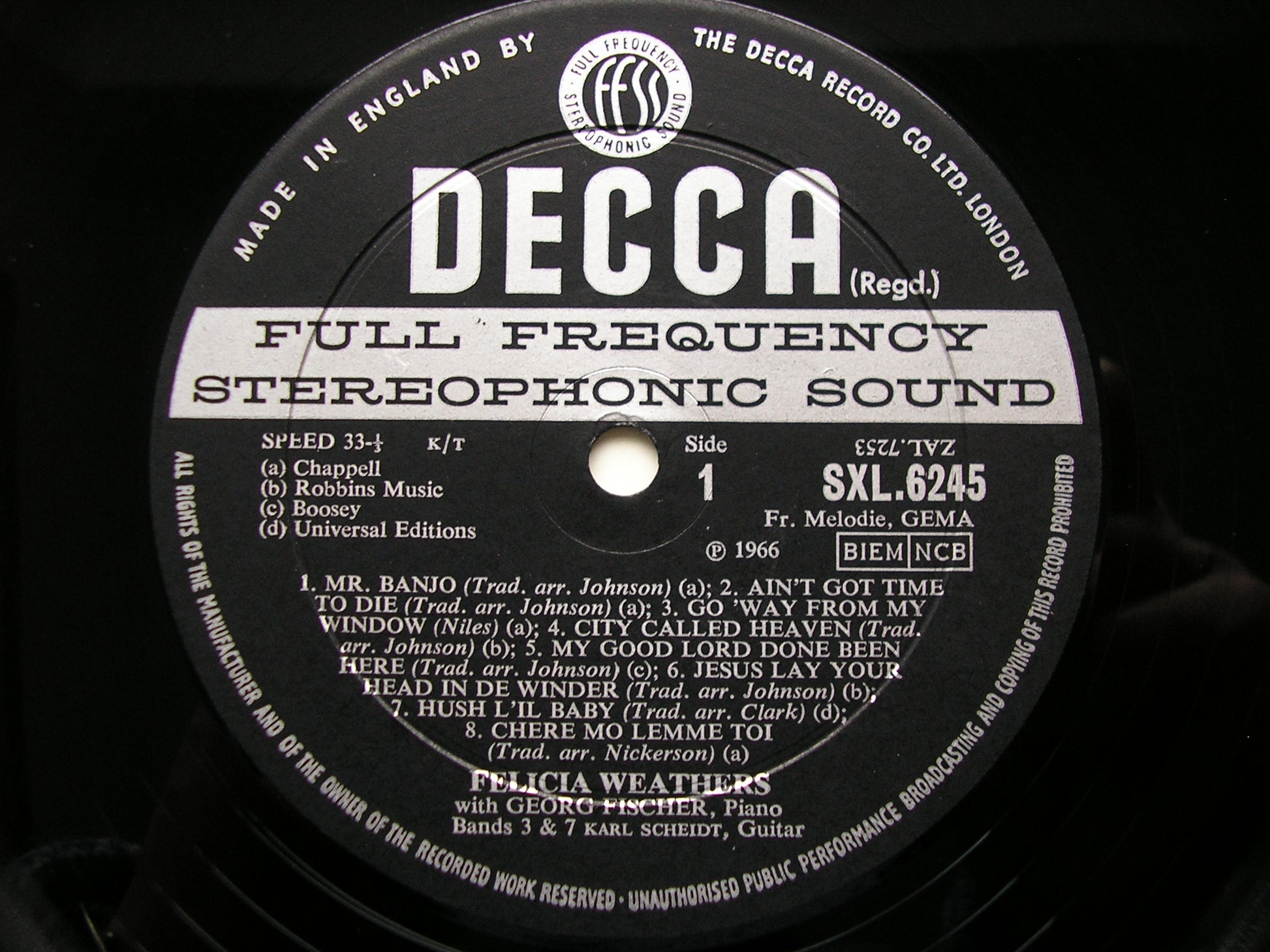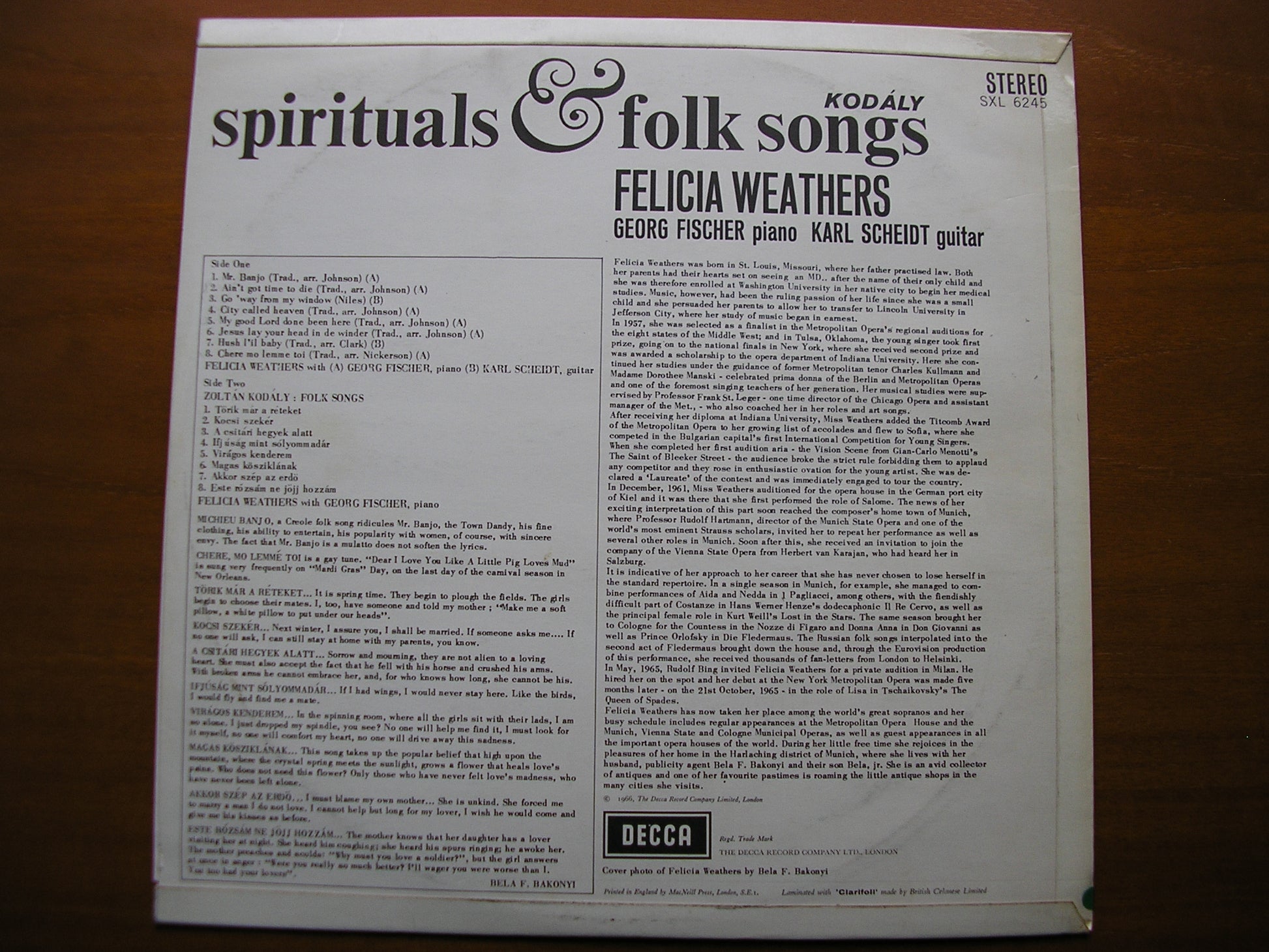 SXL 6245 SPIRITUALS / KODALY: FOLK SONGS    FELICIA WEATHERS / GEORG FISCHER piano / KARL SCHEIDT guitar