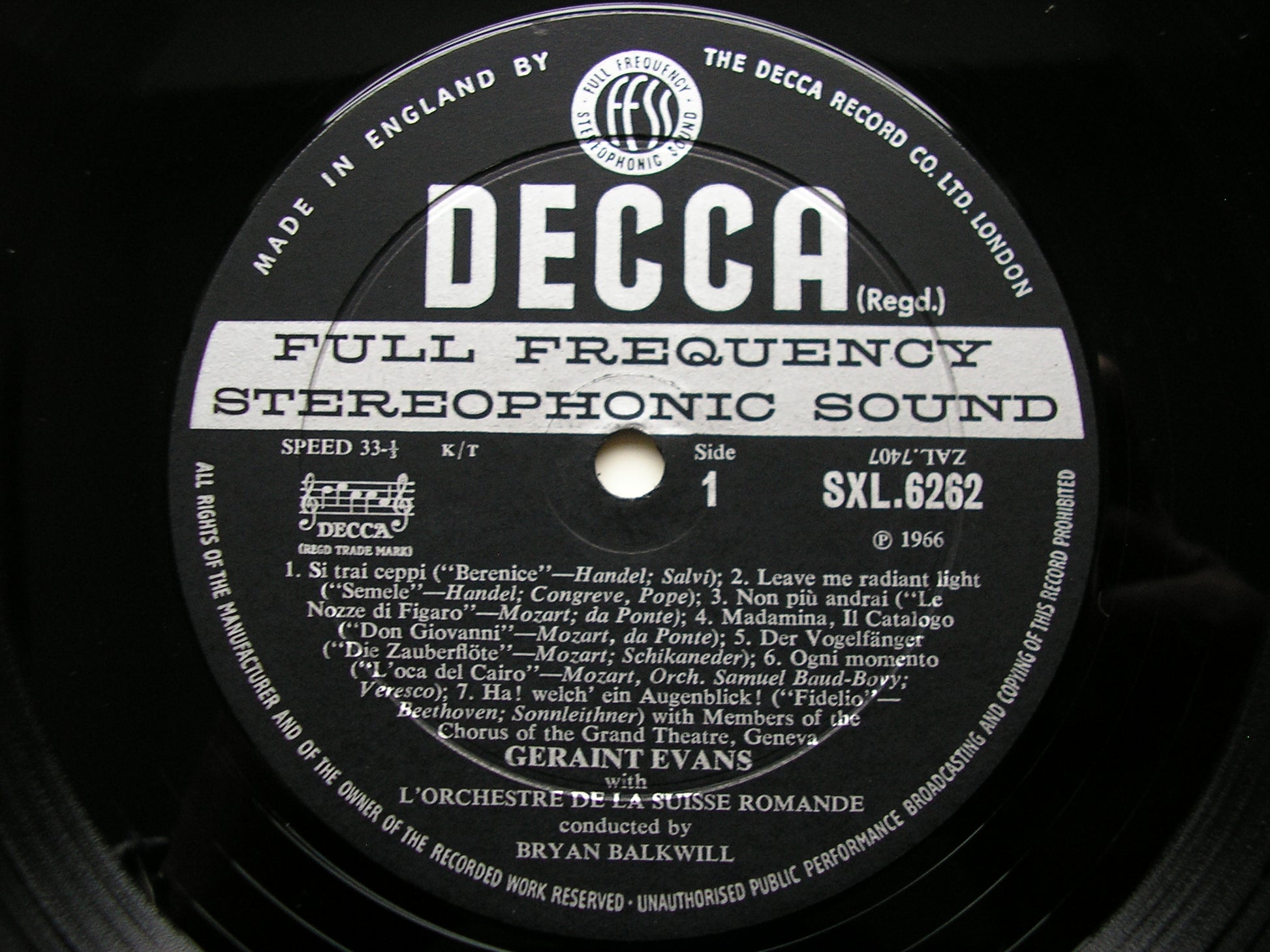 SXL 6262 GERAINT EVANS SINGS OPERA ARIAS: VERDI / MOZART / HANDEL / BEETHOVEN / LEONCAVALLO SUISSE ROMANDE / BALKWILL ED2